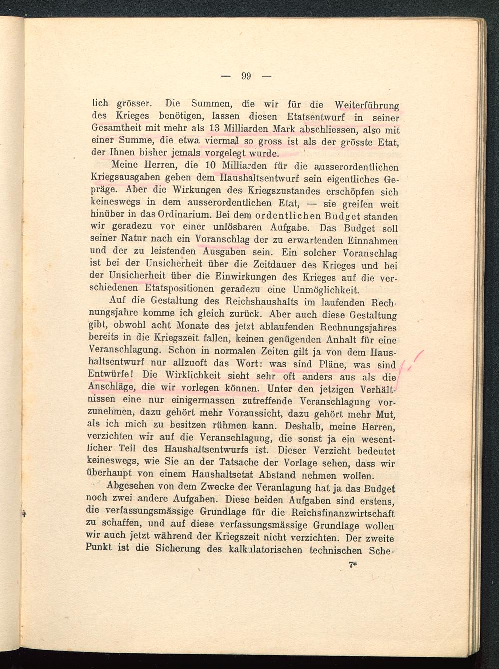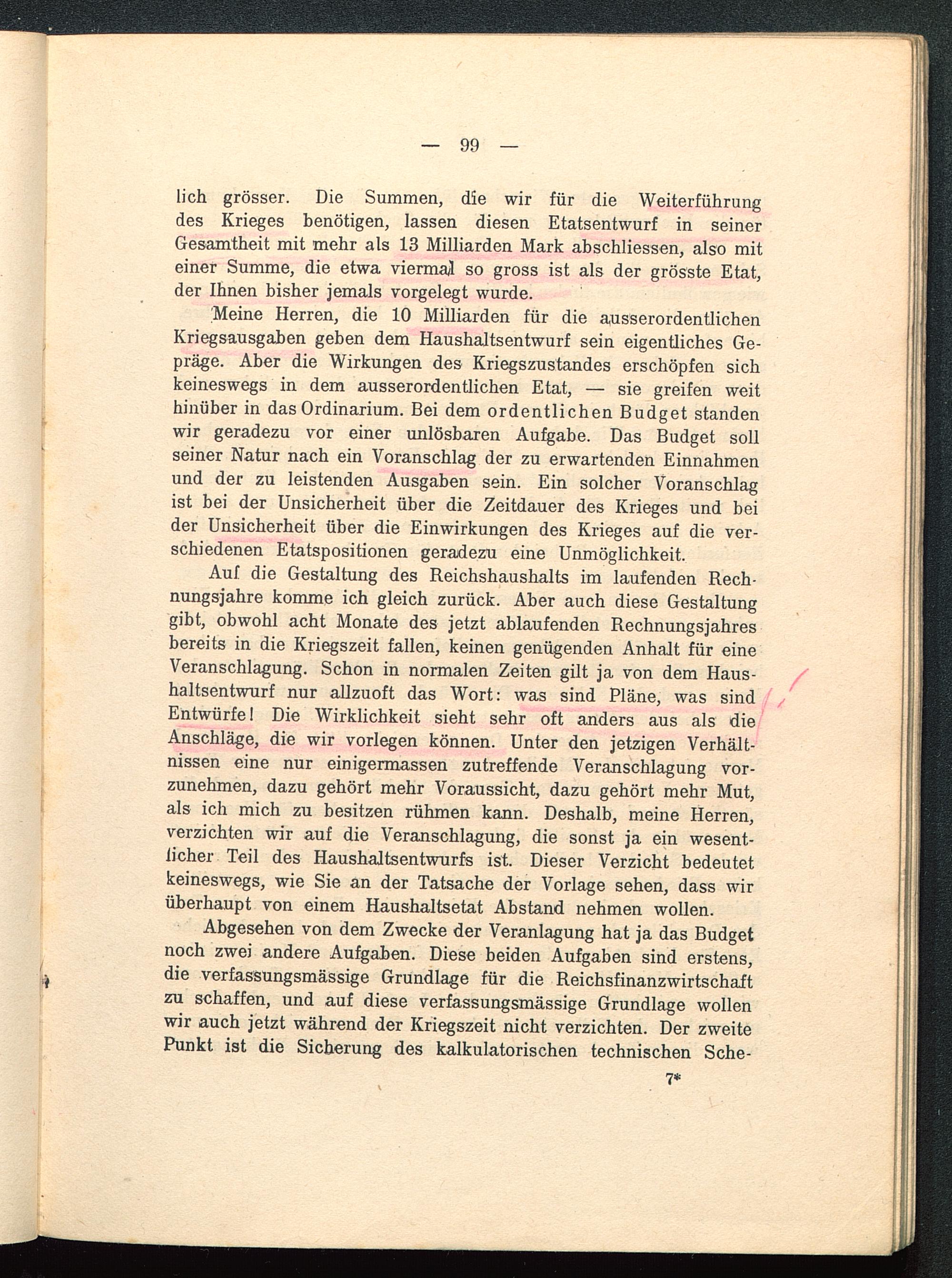 lieh grösser. Die Summen, die wir für die Weiterführungdes Krieges benötigen, lassen diesen Etatsentwurf in seinerGesamtheit mit mehr als 13 Milliarden Mark abschliessen, also miteiner Summe, die etwa viermaj so gross ist als der grösste Etat,der Ihnen bisher jemals vorgelegt wurde.