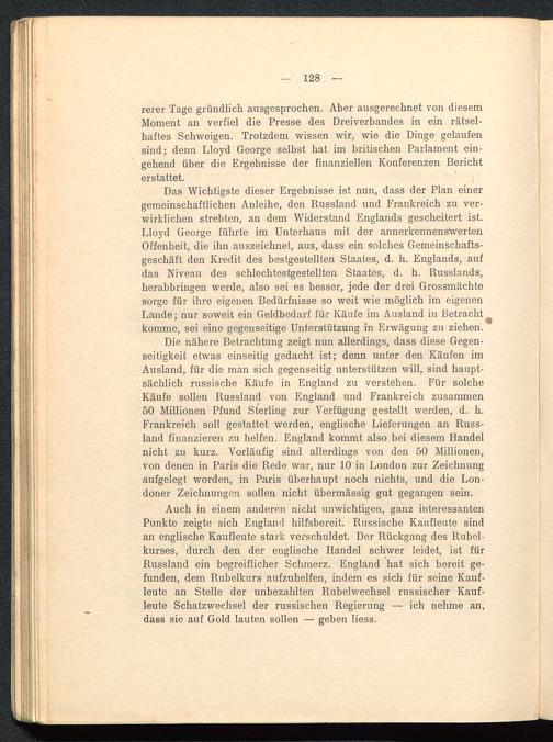 Das Wichtigste dieser Ergebnisse ist nun, dass der Plan einergemeinschaftlichen Anleihe, den Russland und Frankreich zu ver-wirklichen strebten, an dem Widerstand Englands gescheitert ist.Lloyd George führte im Unterhaus mit der annerkennenswertenOffenheit, die ihn auszeichnet, aus, dass ein solches Gemeinschafts-geschäft den Kredit des bestgestellten Staates, d. h. Englands , aufdas Niveau des schlechtestgestellten Staates, d. h. Russlands ,herabbringen werde, also sei es besser, jede der drei Grossmächtesorge für ihre eigenen Bedürfnisse so weit wie möglich im eigenenLande; nur soweit ein Geldbedarf für Käufe im Ausland in Betrachtkomme, sei eine gegenseitige Unterstützung in Erwägung zu ziehen.
