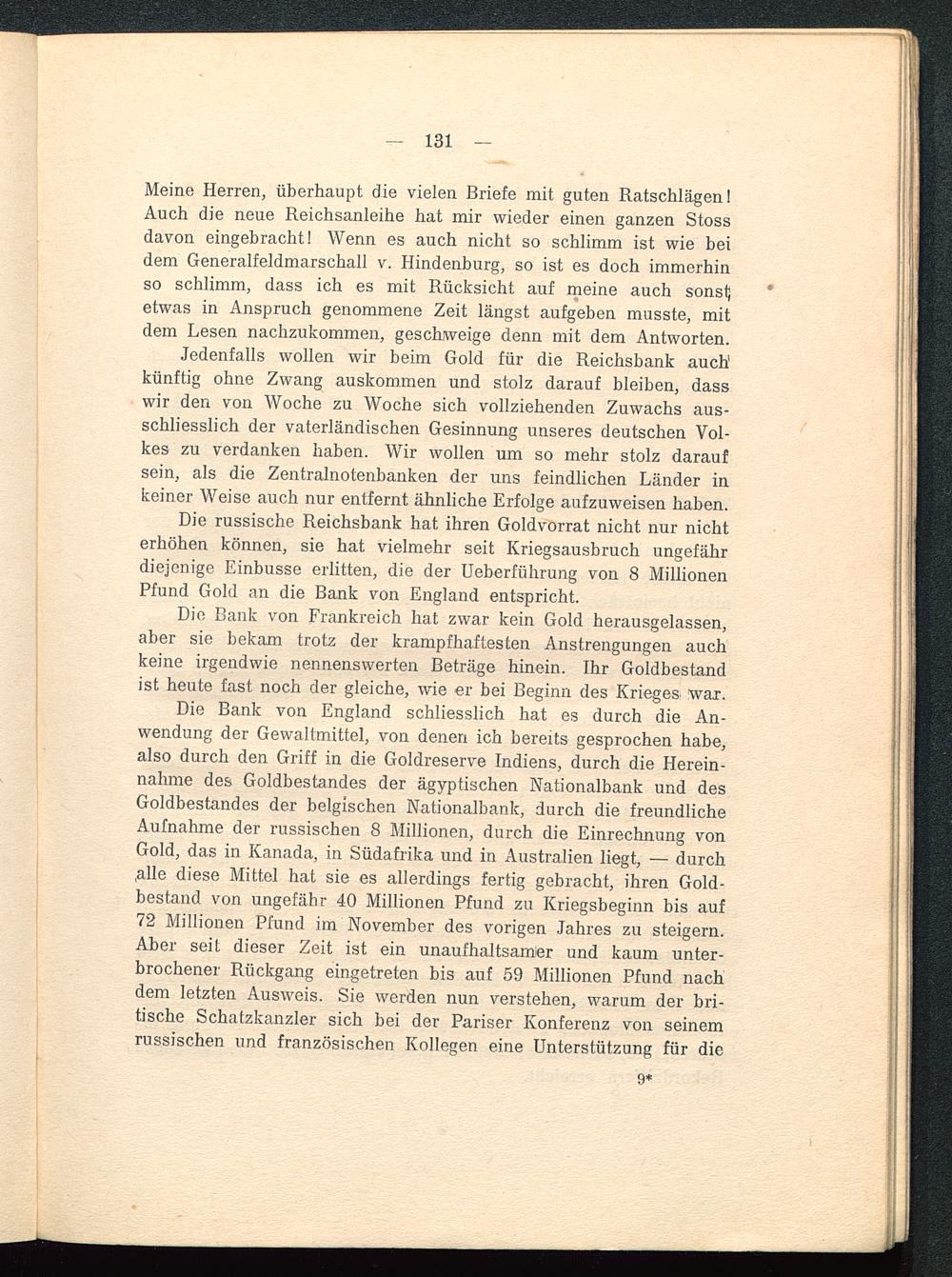 Jedenfalls wollen wir beim Gold für die Reichsbank auchkünftig ohne Zwang auskommen und stolz darauf bleiben, dasswir den von Woche zu Woche sich vollziehenden Zuwachs aus-schliesslich der vaterländischen Gesinnung unseres deutschen Vol-kes zu verdanken haben. Wir wollen um so mehr stolz daraufsein, als die Zentralnotenbanken der uns feindlichen Länder inkeiner Weise auch nur entfernt ähnliche Erfolge aufzuweisen haben.