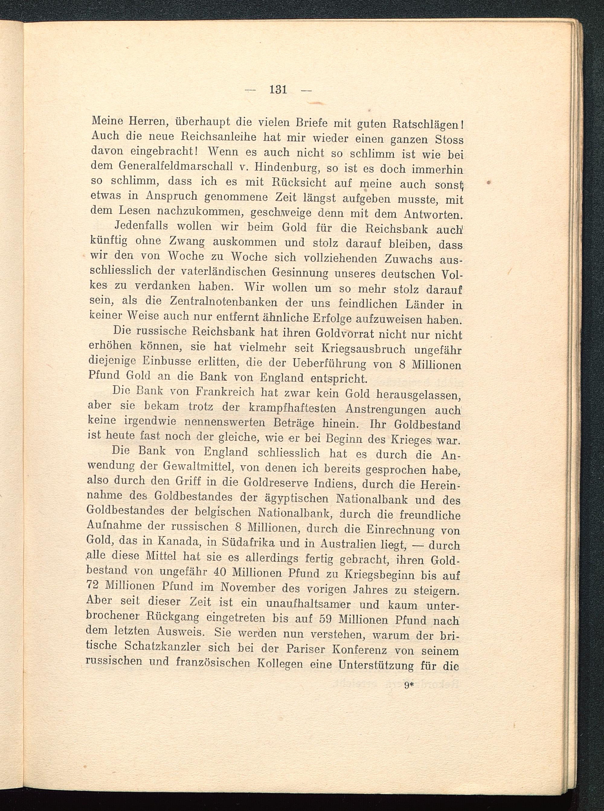Meine Herren, überhaupt die vielen Briefe mit guten Ratschlägen!Auch die neue Reichsanleihe hat mir wieder einen ganzen Stossdavon eingebracht! Wenn es auch nicht so schlimm ist wie beidem Generalfeldmarschall v. Hindenburg , so ist es doch immerhinso schlimm, dass ich es mit Rücksicht auf meine auch sonst:etwas in Anspruch genommene Zeit längst aufgeben musste, mitdem Lesen nachzukommen, geschweige denn mit dem Antworten.