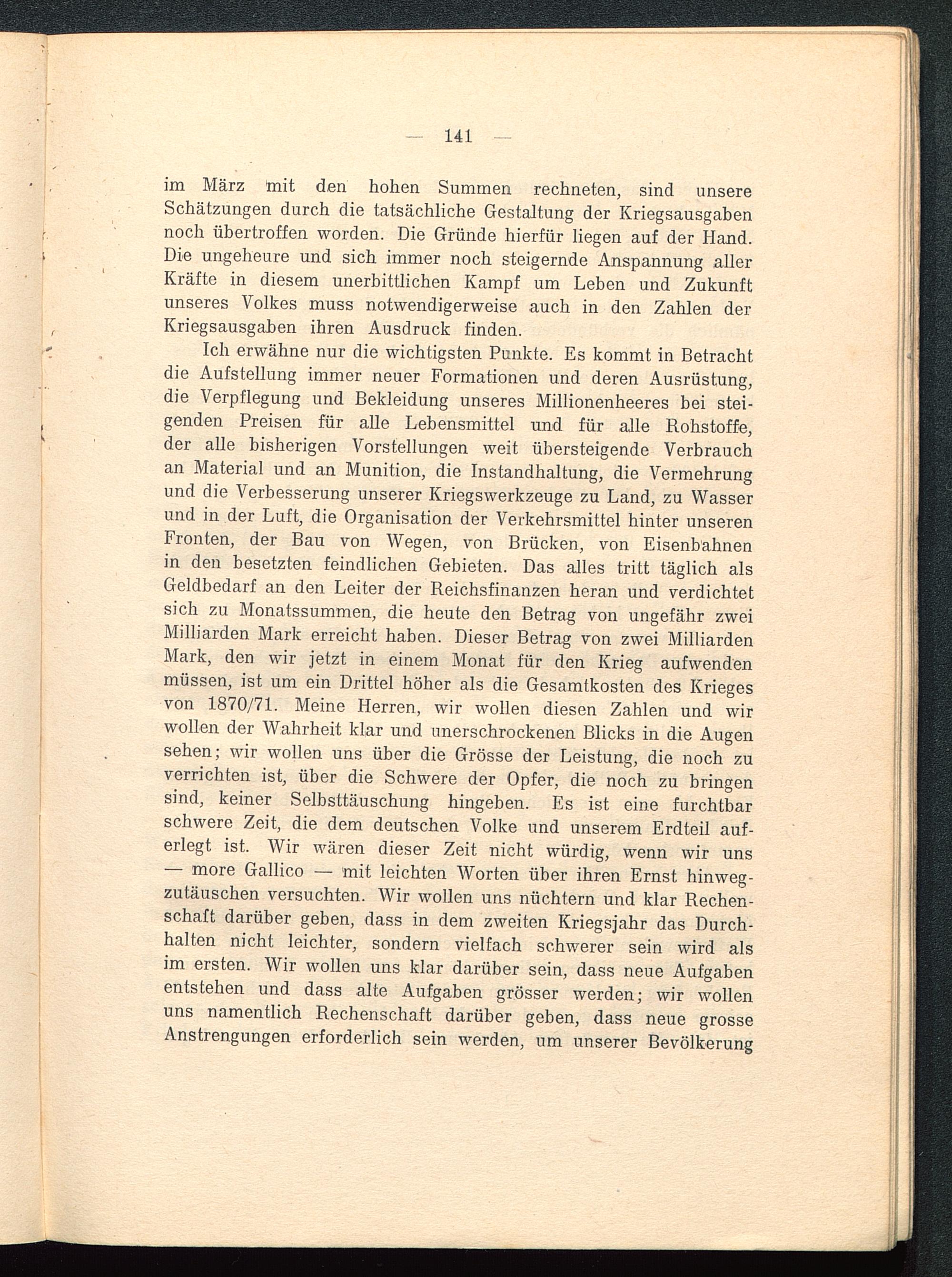 Ich erwähne nur die wichtigsten Punkte. Es kommt in Betrachtdie Aufstellung immer neuer Formationen und deren Ausrüstung,die Verpflegung und Bekleidung unseres Millionenheeres bei stei-genden Preisen für alle Lebensmittel und für alle Rohstoffe,der alle bisherigen Vorstellungen weit übersteigende Verbrauchan Material und an Munition, die Instandhaltung, die Vermehrungund die Verbesserung unserer Kriegswerkzeuge zu Land, zu Wasserund in der Luft, die Organisation der Verkehrsmittel hinter unserenFronten, der Bau von Wegen, von Brücken, von Eisenbahnenin den besetzten feindlichen Gebieten. Das alles tritt täglich alsGeldbedarf an den Leiter der Reichsfinanzen heran und verdichtetsich zu Monatssummen, die heute den Betrag von ungefähr zweiMilliarden Mark erreicht haben. Dieser Betrag von zwei MilliardenMark, den wir jetzt in einem Monat für den Krieg aufwendenmüssen, ist um ein Drittel höher als die Gesamtkosten des Kriegesvon 1870/71. Meine Herren, wir wollen diesen Zahlen und wirwollen der Wahrheit klar und unerschrockenen Blicks in die Augensehen; wir wollen uns über die Grösse der Leistung, die noch zuverrichten ist, über die Schwere der Opfer, die noch zu bringensind, keiner Selbsttäuschung hingeben. Es ist eine furchtbarschwere Zeit, die dem deutschen Volke und unserem Erdteil auf-erlegt ist. Wir wären dieser Zeit nicht würdig, wenn wir uns— more Gallico — mit leichten Worten über ihren Ernst hinweg-zutäuschen versuchten. Wir wollen uns nüchtern und klar Rechen-schaft darüber geben, dass in dem zweiten Kriegsjahr das Durch-halten nicht leichter, sondern vielfach schwerer sein wird alsim ersten. Wir wollen uns klar darüber sein, dass neue Aufgabenentstehen und dass alte Aufgaben grösser werden; wir wollenuns namentlich Rechenschaft darüber geben, dass neue grosseAnstrengungen erforderlich sein werden, um unserer Bevölkerung