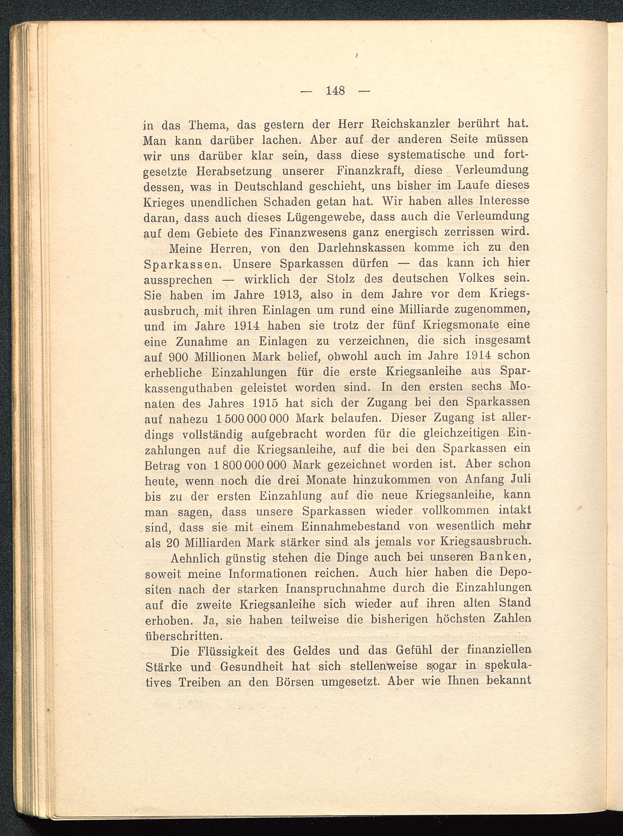 Aehnlich günstig stehen die Dinge auch bei unseren Banken,soweit meine Informationen reichen. Auch hier haben die Depo-siten nach der starken Inanspruchnahme durch die Einzahlungenauf die zweite Kriegsanleihe sich wieder auf ihren alten Standerhoben. Ja, sie haben teilweise die bisherigen höchsten Zahlenüberschritten.