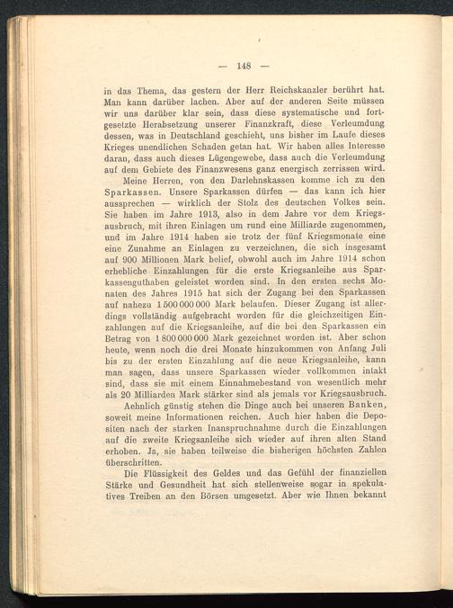 in das Thema, das gestern der Herr Reichskanzler berührt hat.Man kann darüber lachen. Aber auf der anderen Seite müssenwir uns darüber klar sein, dass diese systematische und fort-gesetzte Herabsetzung unserer Finanzkraft, diese Verleumdungdessen, was in Deutschland geschieht, uns bisher im Laufe diesesKrieges unendlichen Schaden getan hat. Wir haben alles Interessedaran, dass auch dieses Lügengewebe, dass auch die Verleumdungauf dem Gebiete des Finanzwesens ganz energisch zerrissen wird.