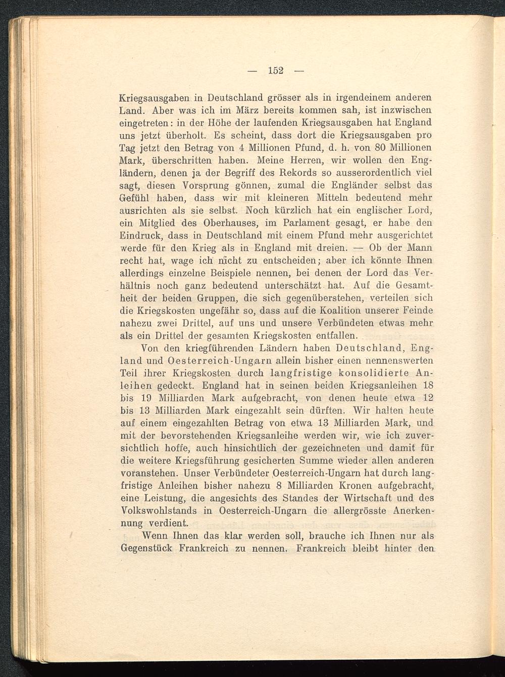 Kriegsausgaben in Deutschland grösser als in irgendeinem anderenLand. Aber was ich im März bereits kommen sah, ist inzwischeneingetreten: in der Höhe der laufenden Kriegsausgaben hat England uns jetzt überholt. Es scheint, dass dort die Kriegsausgaben proTag jetzt den Betrag von 4 Millionen Pfund, d. h. von 80 MillionenMark, überschritten haben. Meine Herren, wir wollen den Eng-ländern, denen ja der Begriff des Rekords so ausserordentlich vielsagt, diesen Vorsprung gönnen, zumal die Engländer selbst dasGefühl haben, dass wir mit kleineren Mitteln bedeutend mehrausrichten als sie selbst. Noch kürzlich hat ein englischer Lord,ein Mitglied des Oberhauses, im Parlament gesagt, er habe denEindruck, dass in Deutschland mit einem Pfund mehr ausgerichtetwerde für den Krieg als in England mit dreien. — Ob der Mannrecht hat, wage ich nicht zu entscheiden; aber ich könnte Ihnenallerdings einzelne Beispiele nennen, bei denen der Lord das Ver-hältnis noch ganz bedeutend unterschätzt hat. Auf die Gesamt-heit der beiden Gruppen, die sich gegenüberstehen, verteilen sichdie Kriegskosten ungefähr so, dass auf die Koalition unserer Feindenahezu zwei Drittel, auf uns und unsere Verbündeten etwas mehrals ein Drittel der gesamten Kriegskosten entfallen.
