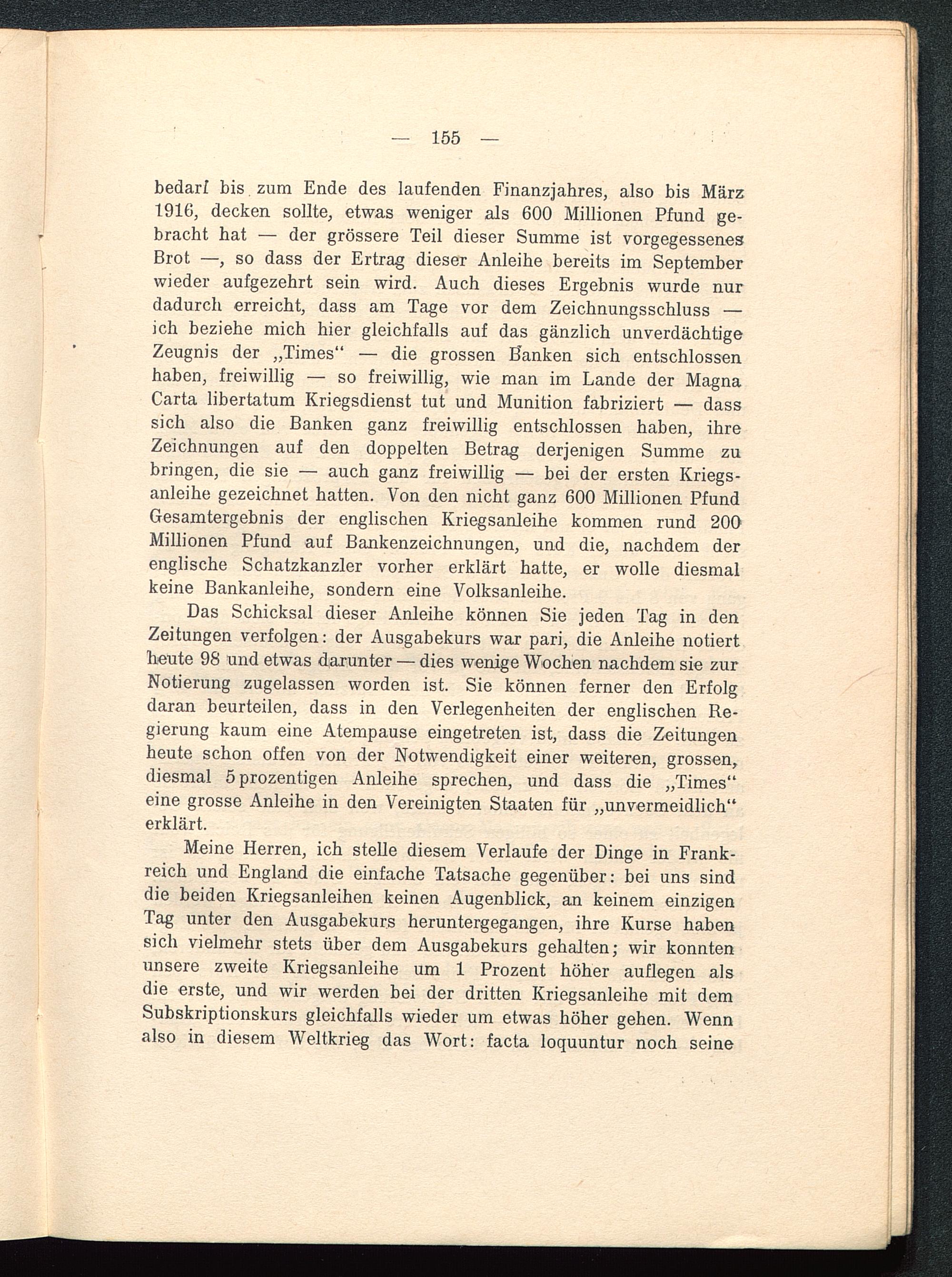 Meine Herren, ich stelle diesem Verlaufe der Dinge in Frank-reich und England die einfache Tatsache gegenüber: bei uns sinddie beiden Kriegsanleihen keinen Augenblick, an keinem einzigenTag unter den Ausgabekurs heruntergegangen, ihre Kurse habensich vielmehr stets über dem Ausgabekurs gehalten; wir konntenunsere zweite Kriegsanleihe um 1 Prozent höher auflegen alsdie erste, und wir werden bei der dritten Kriegsanleihe mit demSubskriptionskurs gleichfalls wieder um etwas höher gehen. Wennalso in diesem Weltkrieg das Wort: facta loquuntur noch seine