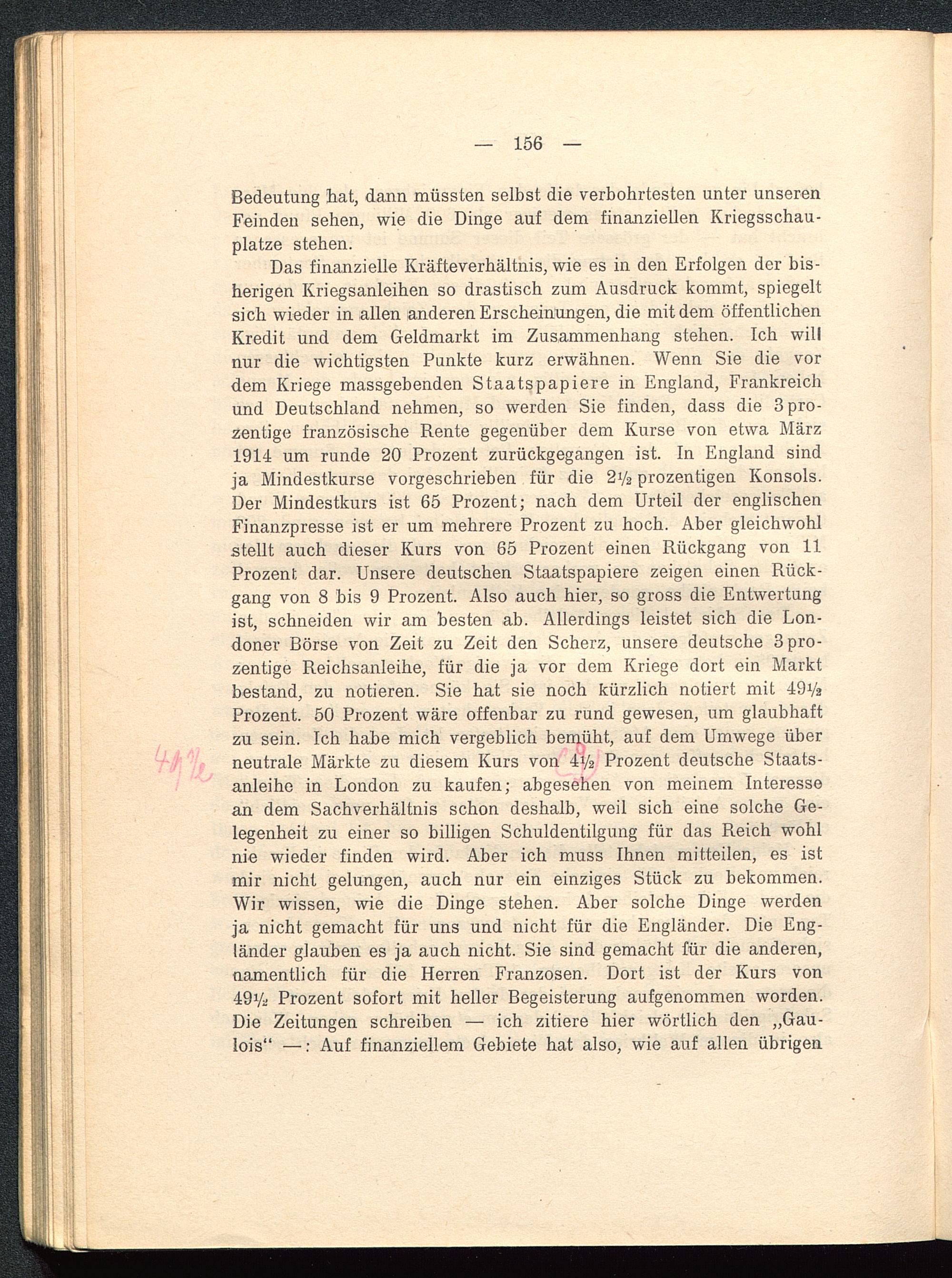 Das finanzielle Kräfteverhältnis, wie es in den Erfolgen der bis-herigen Kriegsanleihen so drastisch zum Ausdruck kommt, spiegeltsich wieder in allen anderen Erscheinungen, die mit dem öffentlichenKredit und dem Geldmarkt im Zusammenhang stehen. Ich willnur die wichtigsten Punkte kurz erwähnen. Wenn Sie die vordem Kriege massgebenden Staatspapiere in England, Frankreich und Deutschland nehmen, so werden Sie finden, dass die 3pro-zentige französische Rente gegenüber dem Kurse von etwa März1914 um runde 20 Prozent zurückgegangen ist. In England sindja Mindestkurse vorgeschrieben für die 2y 2 prozentigen Konsols.Der Mindestkurs ist 65 Prozent; nach dem Urteil der englischenFinanzpresse ist er um mehrere Prozent zu hoch. Aber gleichwohlstellt auch dieser Kurs von 65 Prozent einen Rückgang von 11Prozent dar. Unsere deutschen Staatspapiere zeigen einen Rück-gang von 8 bis 9 Prozent. Also auch hier, so gross die Entwertungist, schneiden wir am besten ab. Allerdings leistet sich die Lon-doner Börse von Zeit zu Zeit den Scherz, unsere deutsche 3pro-zentige Reichsanleihe, für die ja vor dem Kriege dort ein Marktbestand, zu notieren. Sie hat sie noch kürzlich notiert mit 49i/2Prozent. 50 Prozent wäre offenbar zu rund gewesen, um glaubhaftzu sein. Ich habe mich vergeblich bemüht, auf dem Umwege überneutrale Märkte zu diesem Kurs von 4y 2 Prozent deutsche Staats-anleihe in London zu kaufen; abgesehen von meinem Interessean dem Sachverhältnis schon deshalb, weil sich eine solche Ge-legenheit zu einer so billigen Schuldentilgung für das Reich wohlnie wieder finden wird. Aber ich muss Ihnen mitteilen, es istmir nicht gelungen, auch nur ein einziges Stück zu bekommen.Wir wissen, wie die Dinge stehen. Aber solche Dinge werdenja nicht gemacht für uns und nicht für die Engländer. Die Eng-länder glauben es ja auch nicht. Sie sind gemacht für die anderen,namentlich für die Herren Franzosen. Dort ist der Kurs von49y- Prozent sofort mit heller Begeisterung aufgenommen worden.Die Zeitungen schreiben — ich zitiere hier wörtlich den „Gau-lois" —: Auf finanziellem Gebiete hat also, wie auf allen übrigen