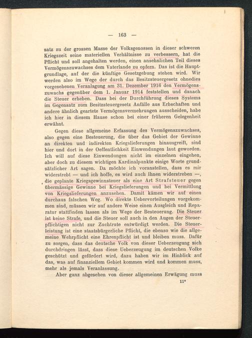 Gegen diese allgemeine Erfassung des Vermögenszuwachses,also gegen eine Besteuerung, die über das Gebiet der Gewinnean direkten und indirekten Kriegslieferungen hinausgreift, sindhier und dort in der Oeffentlichkeit Einwendungen laut geworden.Ich will auf diese Einwendungen nicht im einzelnen eingehen,aber doch zu diesem wichtigen Kardinalpunkte einige Worte grund-sätzlicher Art sagen. Da möchte ich voranstellen, dass es mirwiderstrebt — und ich hoffe, es wird auch Ihnen widerstreben —,t die geplante Kriegsgewinnsteuer als eine Art Strafsteuer gegenübermässige Gewinne bei Kriegslieferungen und bei Vermittlungvon Kriegslieferungen anzusehen. Damit kämen wir auf einendurchaus falschen Weg. Wo direkte Uebervorteilungen vorgekom-men sind, müssen wir auf andere Weise einen Ausgleich und Bepa-ratur stattfinden lassen als im Wege der Besteuerung. Die Steuerist keine Strafe, und die Steuer soll auch in den Augen der Steuer-pflichtigen nicht zur Zuchtrute entwürdigt werden. Die Steuer-leistung ist eine staatsbürgerliche Pflicht, die ebenso wie die allge-meine Wehrpflicht eine Ehrenpflicht ist und bleiben muss. Dafürzu sorgen, dass das deutsche Volk von dieser Ueberzeugung Bichdurchdringen lässt, dass diese Ueberzeugung im deutschen Volkegeschützt und gefördert wird, dazu haben wir im Hinblick aufdas, was auf finanziellem Gebiet kommen wird und kommen muss,mehr als jemals Veranlassung.