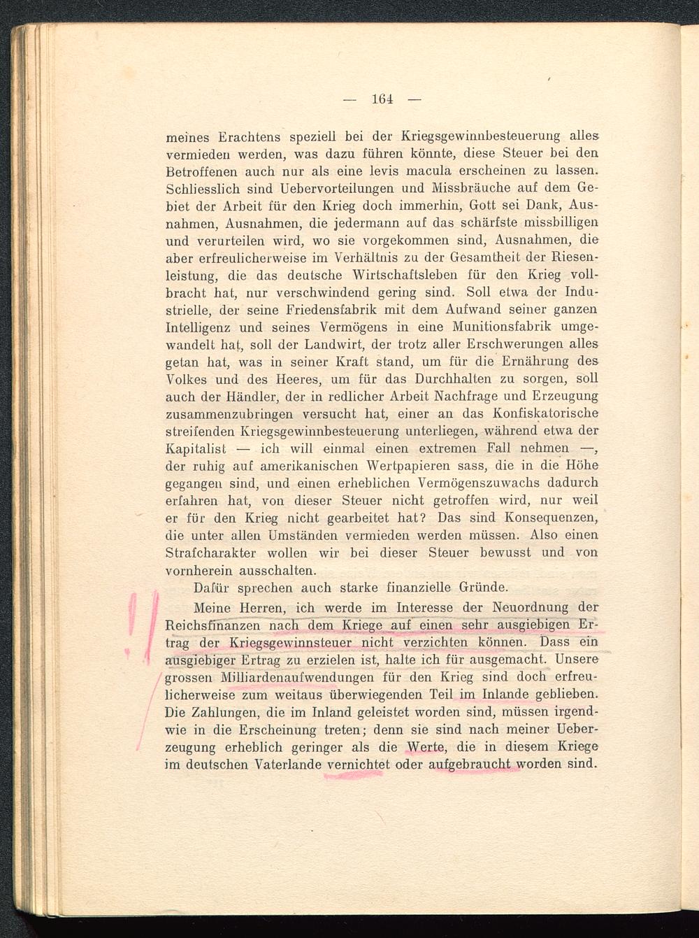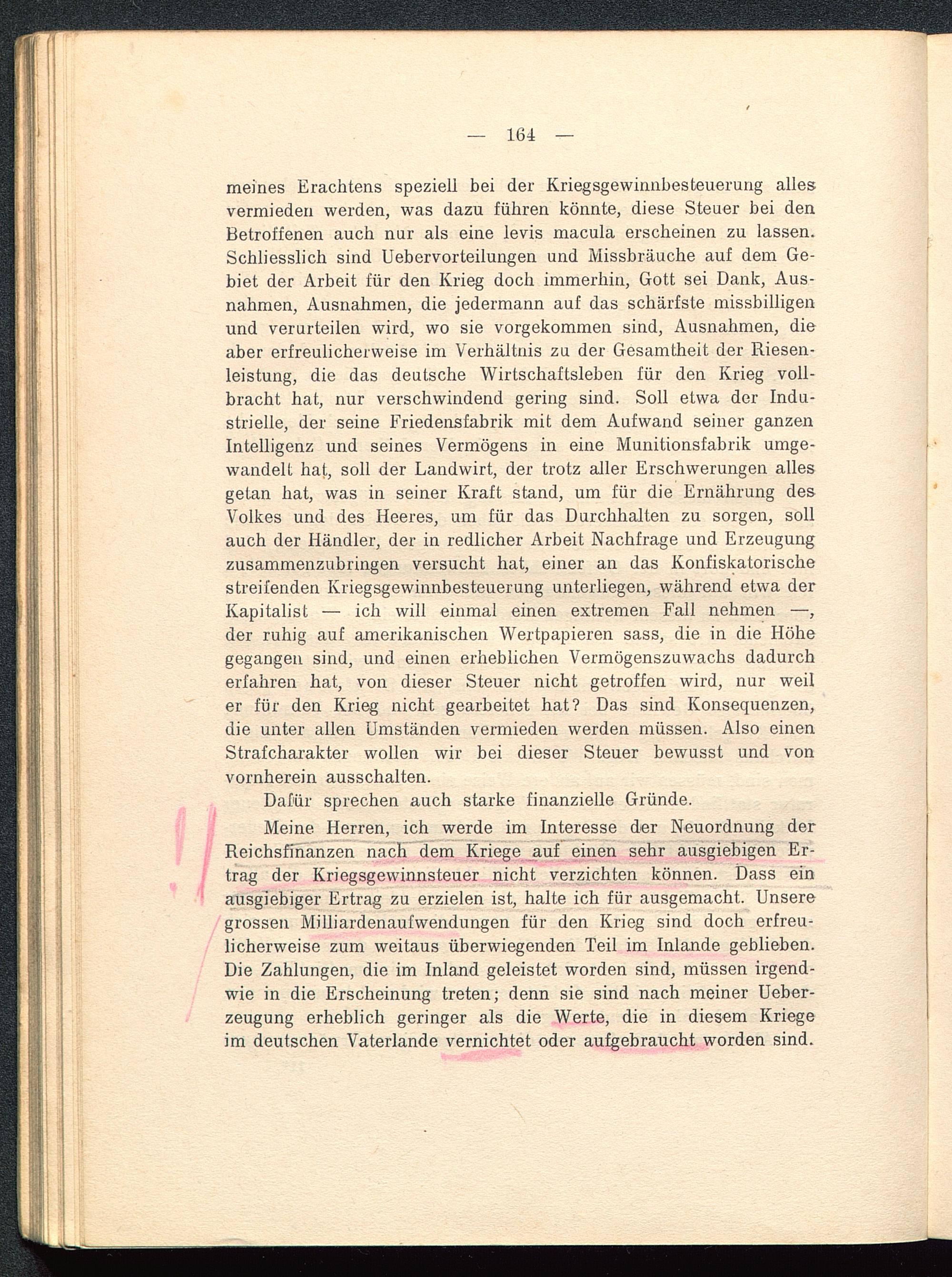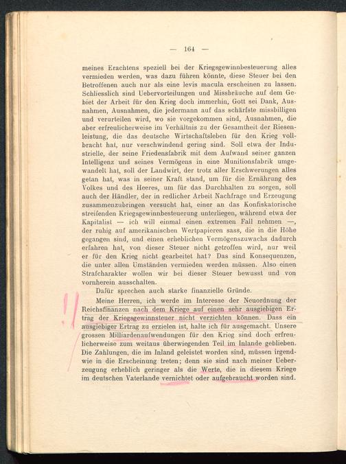meines Erachtens speziell bei der Kriegsgewinnbesteuerung allesvermieden werden, was dazu führen könnte, diese Steuer bei denBetroffenen auch nur als eine levis macula erscheinen zu lassen.Schliesslich sind Uebervorteilungen und Missbräuche auf dem Ge-biet der Arbeit für den Krieg doch immerhin, Gott sei Dank, Aus-nahmen, Ausnahmen, die jedermann auf das schärfste missbilligenund verurteilen wird, wo sie vorgekommen sind, Ausnahmen, dieaber erfreulicherweise im Verhältnis zu der Gesamtheit der Riesen-leistung, die das deutsche Wirtschaftsleben für den Krieg voll-bracht hat, nur verschwindend gering sind. Soll etwa der Indu-strielle, der seine Friedensfabrik mit dem Aufwand seiner ganzenIntelligenz und seines Vermögens in eine Munitionsfabrik umge-wandelt hat, soll der Landwirt, der trotz aller Erschwerungen allesgetan hat, was in seiner Kraft stand, um für die Ernährung desVolkes und des Heeres, um für das Durchhalten zu sorgen, sollauch der Händler, der in redlicher Arbeit Nachfrage und Erzeugungzusammenzubringen versucht hat, einer an das Konfiskatorischestreifenden Kriegsgewinnbesteuerung unterliegen, während etwa derKapitalist — ich will einmal einen extremen Fall nehmen —,der ruhig auf amerikanischen Wertpapieren sass, die in die Höhegegangen sind, und einen erheblichen Vermögenszuwachs dadurcherfahren hat, von dieser Steuer nicht getroffen wird, nur weiler für den Krieg nicht gearbeitet hat? Das sind Konsequenzen,die unter allen Umständen vermieden werden müssen. Also einenStrafcharakter wollen wir bei dieser Steuer bewusst und vonvornherein ausschalten.