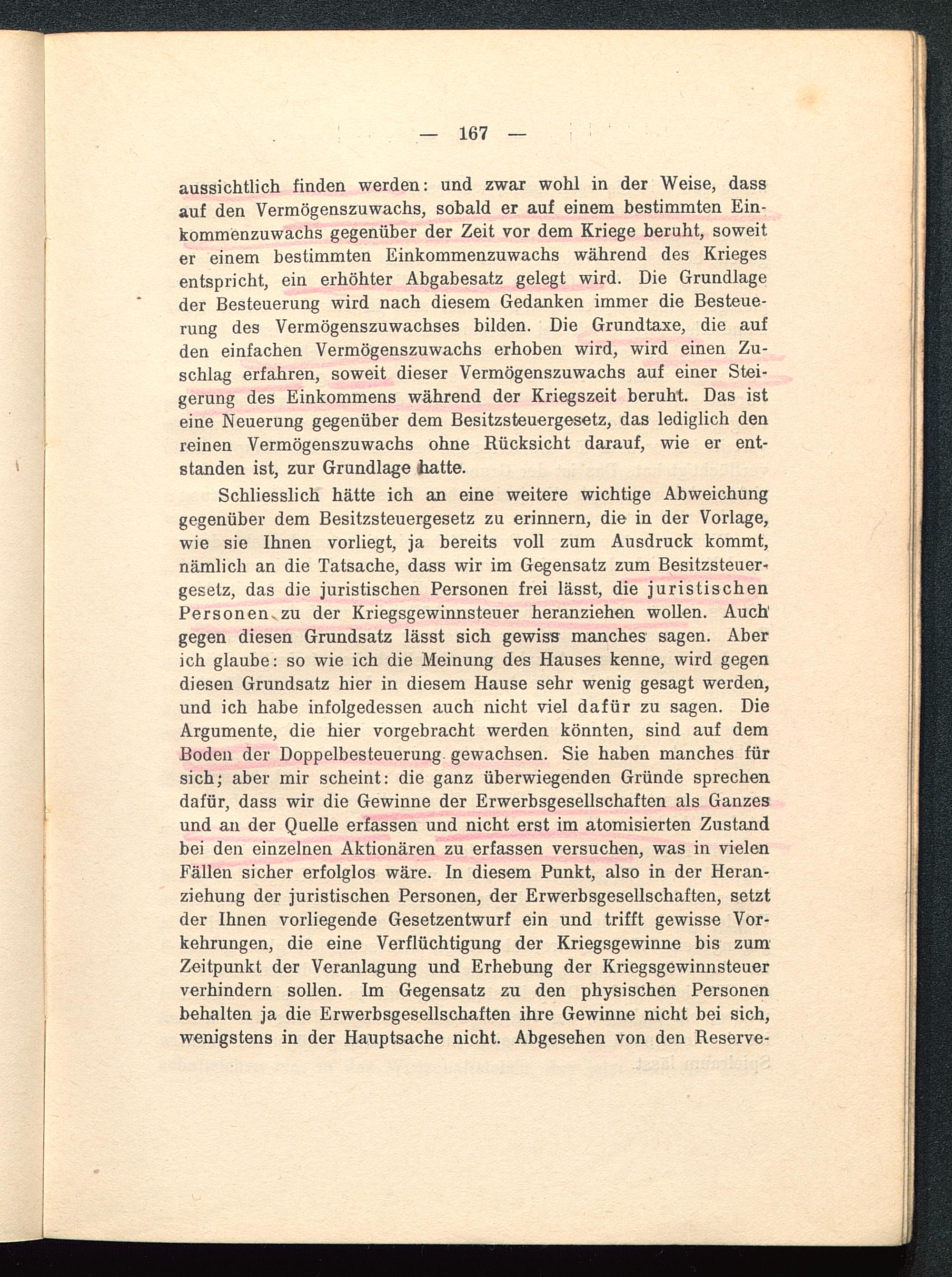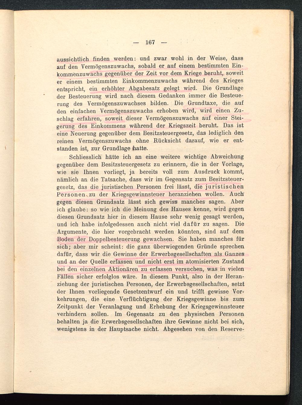aussichtlich finden werden: und zwar wohl in der Weise, dassauf den Vermögenszuwachs, sobald er auf einem bestimmten Ein-kommenzuwachs gegenüber der Zeit vor dem Kriege beruht, soweiter einem bestimmten Einkommenzuwachs während des Kriegesentspricht, ein erhöhter Abgabesatz gelegt wird. Die Grundlageder Besteuerung wird nach diesem Gedanken immer die Besteue-rung des Vermögenszuwachses bilden. Die Grundtaxe, die aufden einfachen Vermögenszuwachs erhoben wird, wird einen Zu-schlag erfahren, soweit dieser Vermögenszuwachs auf einer Stei-gerung des Einkommens während der Kriegszeit beruht. Das isteine Neuerung gegenüber dem Besitzsteuergesetz, das lediglich denreinen Vermögenszuwachs ohne Rücksicht darauf, wie er ent-standen ist, zur Grundlage ihatte.