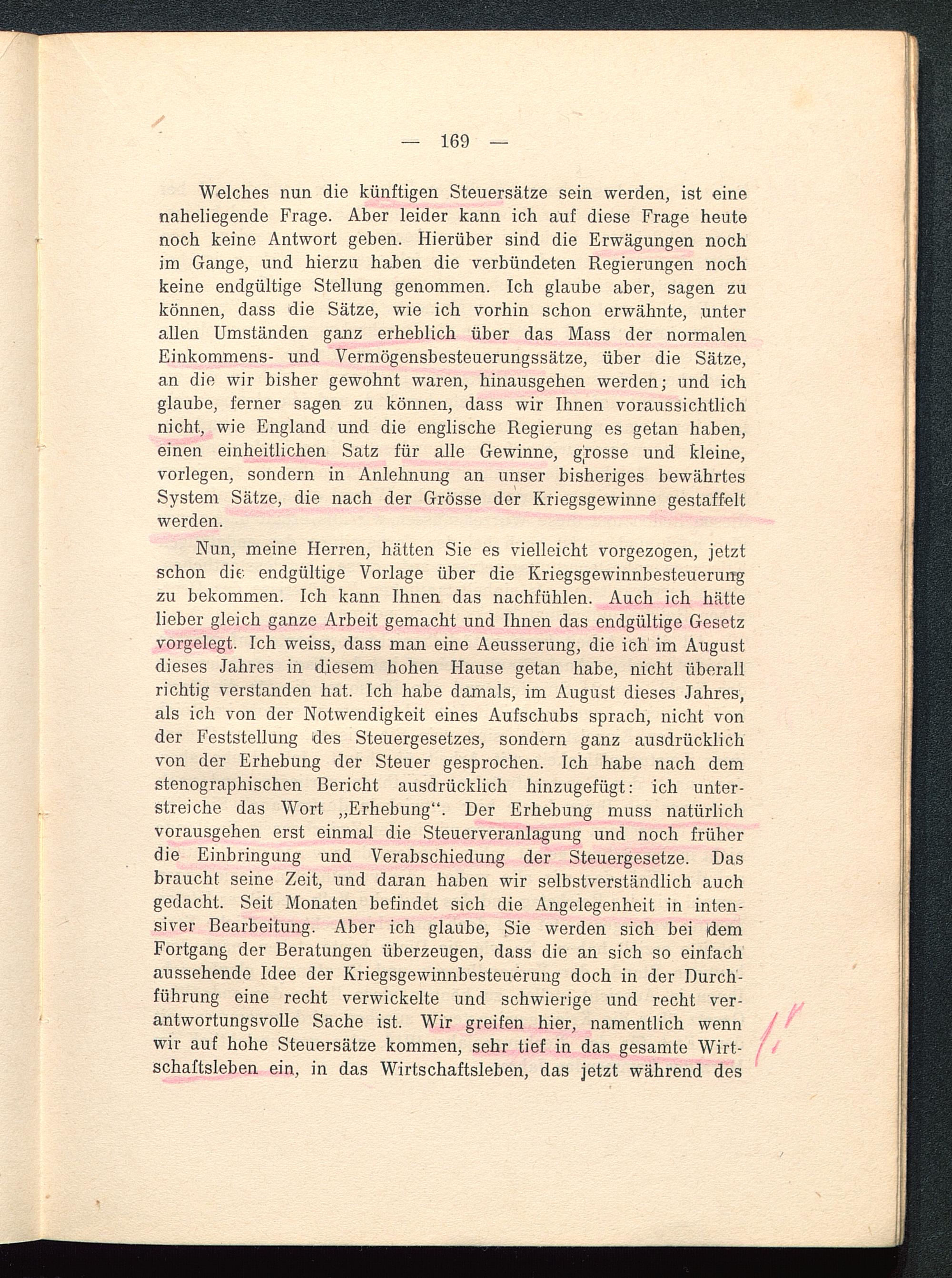 Nun, meine Herren, hätten Sie es vielleicht vorgezogen, jetztschon die endgültige Vorlage über die Kriegsgewinnbesteuerungzu bekommen. Ich kann Ihnen das nachfühlen. Auch ich hättelieber gleich ganze Arbeit gemacht und Ihnen das endgültige Gesetzvorgelegt. Ich weiss, dass man eine Aeusserung, die ich im Augustdieses Jahres in diesem hohen Hause getan habe, nicht überallrichtig verstanden hat. Ich habe damals, im August dieses Jahres,als ich von der Notwendigkeit eines Aufschubs sprach, nicht vonder Feststellung des Steuergesetzes, sondern ganz ausdrücklichvon der Erhebung der Steuer gesprochen. Ich habe nach demstenographischen Bericht ausdrücklich hinzugefügt: ich unter-streiche das Wort „Erhebung". Der Erhebung muss natürlichvorausgehen erst einmal die Steuerveranlagung und noch früherdie Einbringung und Verabschiedung der Steuergesetze. Dasbraucht seine Zeit, und daran haben wir selbstverständlich auchgedacht. Seit Monaten befindet sich die Angelegenheit in inten-siver Bearbeitung. Aber ich glaube, Sie werden sich bei demFortgang der Beratungen überzeugen, dass die an sich so einfachaussehende Idee der Kriegsgewinnbesteuerung doch in der Durch-führung eine recht verwickelte und schwierige und recht ver-antwortungsvolle Sache ist. Wir greifen hier, namentlich wennwir auf hohe Steuersätze kommen, sehr tief in das gesamte Wirt-schaftsleben ein, in das Wirtschaftsleben, das jetzt während des