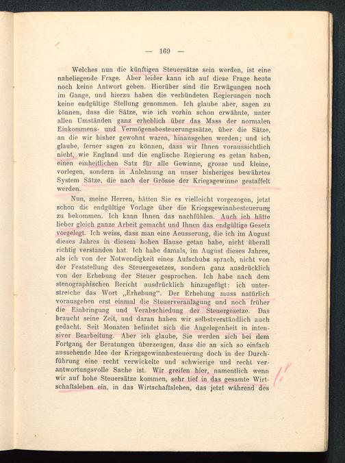 Welches nun die künftigen Steuersätze sein werden, ist einenaheliegende Frage. Aber leider kann ich auf diese Frage heutenoch keine Antwort geben. Hierüber sind die Erwägungen nochim Gange, und hierzu haben die verbündeten Regierungen nochkeine endgültige Stellung genommen. Ich glaube aber, sagen zukönnen, dass die Sätze, wie ich vorhin schon erwähnte, unterallen Umständen ganz erheblich über das Mass der normalenEinkommens- und Vermögensbesteuerungssätze, über die Sätze,an die wir bisher gewohnt waren, hinausgehen werden; und ichglaube, ferner sagen zu können, dass wir Ihnen voraussichtlichnicht, wie England und die englische Regierung es getan haben,einen einheitlichen Satz für alle Gewinne, grosse und kleine,vorlegen, sondern in Anlehnung an unser bisheriges bewährtesSystem Sätze, die nach der Grösse der Kriegsgewinne gestaffeltwerden.