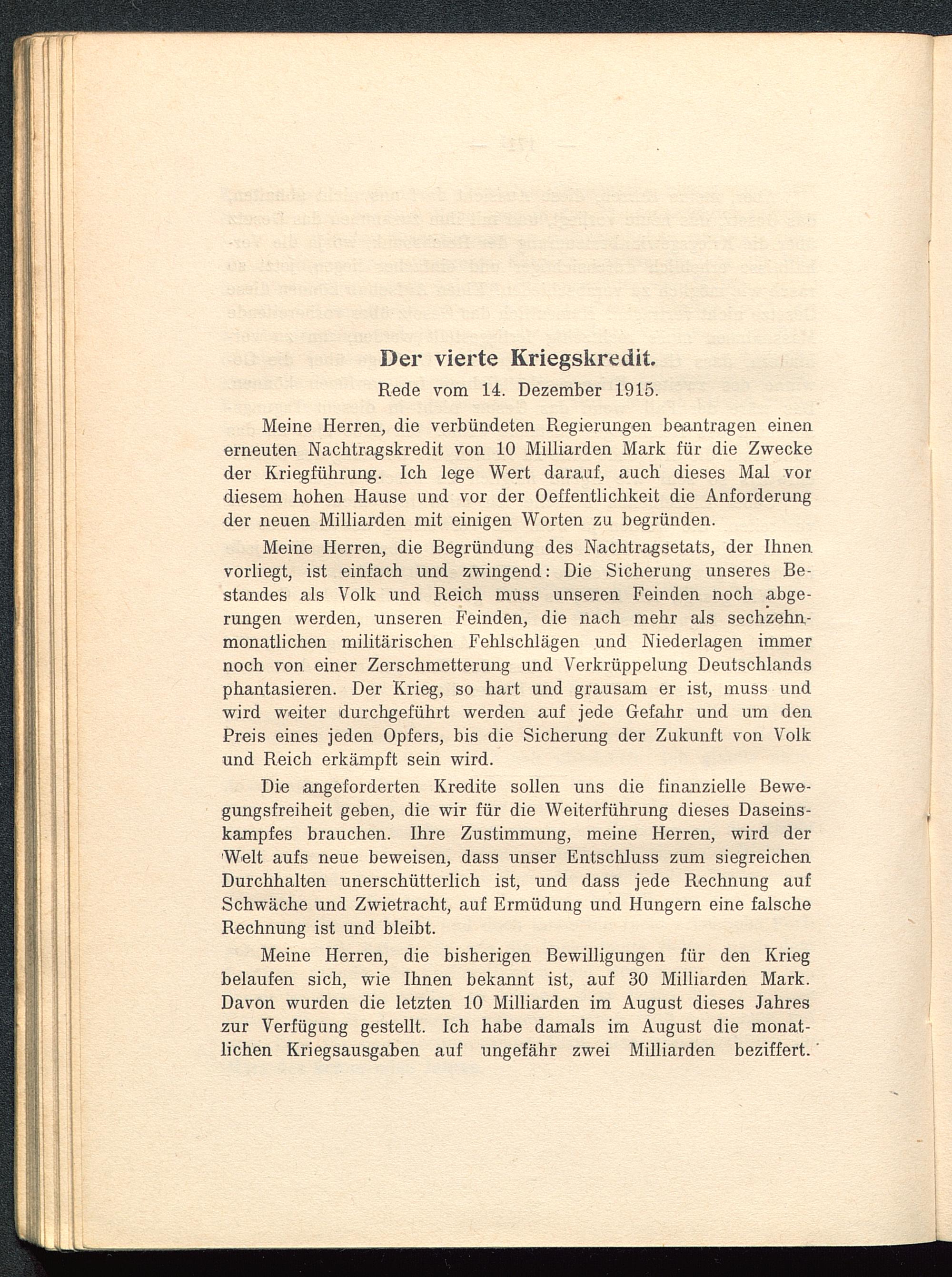 Die angeforderten Kredite sollen uns die finanzielle Bewe-gungsfreiheit geben, die wir für die Weiterführung dieses Daseins-kampfes brauchen. Ihre Zustimmung, meine Herren, wird derWelt aufs neue beweisen, dass unser Entschluss zum siegreichenDurchhalten unerschütterlich ist, und dass jede Rechnung aufSchwäche und Zwietracht, auf Ermüdung und Hungern eine falscheRechnung ist und bleibt.
