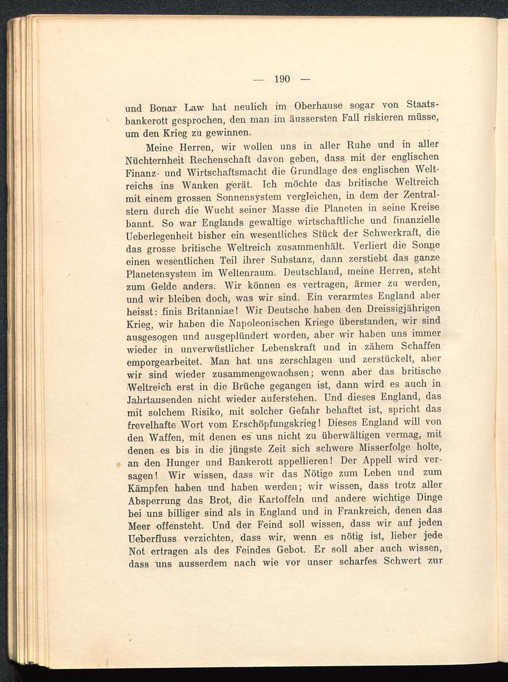 Meine Herren, wir wollen uns in aller Ruhe und in allerNüchternheit Rechenschaft davon geben, dass mit der englischenFinanz- und Wirtschaftsmacht die Grundlage des englischen Welt-reichs ins Wanken g'erät. Ich möchte das britische Weltreichmit einem grossen Sonnensystem vergleichen, in dem der Zentral-stern durch die Wucht seiner Masse die Planeten in seine Kreisebannt. So war Englands gewaltige wirtschaftliche und finanzielleUeberlegenheit bisher ein wesentliches Stück der Schwerkraft, diedas grosse britische Weltreich zusammenhält. Verliert die Sonneeinen wesentlichen Teil ihrer Substanz, dann zerstiebt das ganzePlanetensystem im Weltenraum. Deutschland , meine Herren, stehtzum Gelde anders. Wir können es vertragen, ärmer zu werden,und wir bleiben doch, was wir sind. Ein verarmtes England aberheisst: finis Britanniae! Wir Deutsche haben den DreissigjährigenKrieg, wir haben die Napoleonischen Kriege überstanden, wir sindausgesogen und ausgeplündert worden, aber wir haben uns immerwieder in unverwüstlicher Lebenskraft und in zähem Schaffenemporgearbeitet. Man hat uns zerschlagen und zerstückelt, aberwir sind wieder zusammengewachsen; wenn aber das britischeWeltreich erst in die Brüche gegangen ist, dann wird es auch inJahrtausenden nicht wieder auferstehen. Und dieses England , dasmit solchem Risiko, mit solcher Gefahr behaftet ist, spricht dasfrevelhafte Wort vom Erschöpfungskrieg! Dieses England will vonden Waffen, mit denen es uns nicht zu überwältigen vermag, mitdenen es bis in die jüngste Zeit sich schwere Misserfolgc holte,an den Hunger und Bankerott appellieren! Der Appell wird ver-sagen! Wir wissen, dass wir das Nötige zum Leben und zumKämpfen haben und haben werden; wir wissen, dass trotz allerAbsperrung das Brot, die Kartoffeln und andere wichtige Dingebei uns billiger sind als in England und in Frankreich , denen dasMeer offensteht. Und der Feind soll wissen, dass wir auf jedenUeberfluss verzichten, dass wir, wenn es nötig ist, lieber jedeNot ertragen als des Feindes Gebot. Er soll aber auch wissen,dass Uns ausserdem nach wie vor unser scharfes Schwert zur