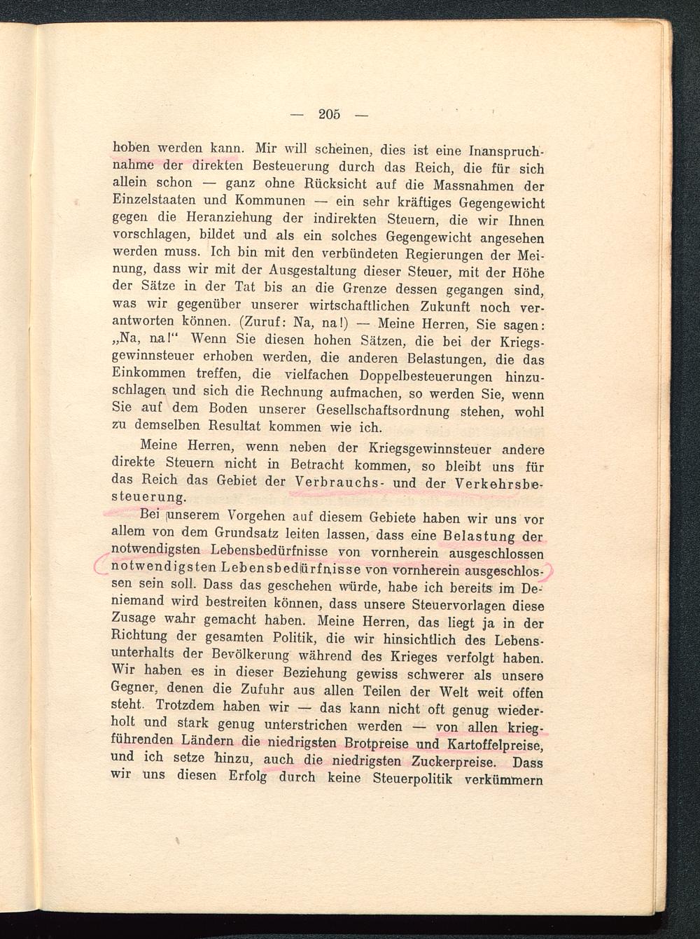 Bei (unserem Vorgehen auf diesem Gebiete haben wir uns vorallem von dem Grundsatz leiten lassen, dass eine Belastung dernotwendigsten Lebensbedürfnisse von vornherein ausgeschlossennotwendigsten Lebensbedürfnisse von vornherein ausgeschlos-sen sein soll. Dass das geschehen würde, habe ich bereits im De-niemand wird bestreiten können, dass unsere Steuervorlagen dieseZusage wahr gemacht haben. Meine Herren, das liegt ja in derRichtung der gesamten Politik, die wir hinsichtlich des Lebens-unterhalts der Bevölkerung während des Krieges verfolgt haben.Wir haben es in dieser Beziehung gewiss schwerer als unsereGegner, denen die Zufuhr aus allen Teilen der Welt weit offensteht. Trotzdem haben wir — das kann nicht oft genug wieder-holt und stark genug unterstrichen werden — von allen krieg-führenden Ländern die niedrigsten Brotpreise und Kartoffelpreise,und ich setze hinzu, auch die niedrigsten Zuckerpreise. Dasswir uns diesen Erfolg durch keine Steuerpolitik verkümmern