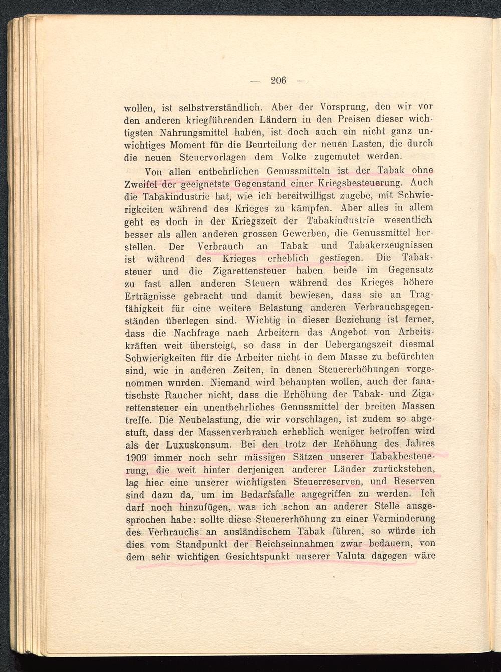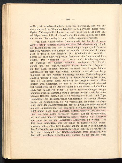 Von allen entbehrlichen Genussmitteln ist der Tabak ohneZweifel der geeignetste Gegenstand einer Kriegsbesteuerung. Auchdie Tahakindustrie hat, wie ich bereitwilligst zugebe, mit Schwie-rigkeiten während des Krieges zu kämpfen. Aber alles in allemgeht es doch in der Kriegszeit der Tabakindustrie wesentlichbesser als allen anderen grossen Gewerben, die Genussmittel her-stellen. Der Verbrauch an Tabak und Tabakerzeugnissenist während des Krieges erheblich gestiegen. Die Tabak-steuer und die Zigarettensteuer haben beide im Gegensatzzu fast allen anderen Steuern während des Krieges höhereErträgnisse gebracht und damit bewiesen, dass sie an Trag-fähigkeit für eine weitere Belastung anderen Verbrauchsgegen-ständen überlegen sind. Wichtig in dieser Beziehung ist ferner,dass die Nachfrage nach Arbeitern das Angebot von Arbeits-kräften weit übersteigt, so dass in der Uebergangszeit diesmalSchwierigkeiten für die Arbeiter nicht in dem Masse zu befürchtensind, wie in anderen Zeiten, in denen Steuererhöhungen, vorge-nommen wurden. Niemand wird behaupten wollen, auch der fana-tischste Raucher nicht, dass die Erhöhung der Tabak- und Ziga-rettensteuer ein unentbehrliches Genussmittel der breiten Massentreffe. Die Neubelastung, die wir vorschlagen, ist zudem so abge-stuft, dass der Massenverbrauch erheblich weniger betroffen wirdals der Luxuskonsum. Bei den trotz der Erhöhung des Jahres1909 immer noch sehr mässigen Sätzen unserer Tabakbesteue-rung, die weit hinter derjenigen anderer Länder zurückstehen,lag hier eine unserer wichtigsten Steuerreserven, und Reservensind dazu da, um im Bedarfsfälle angegriffen zu werden. Ichdarf noch hinzufügen, was ich schon an anderer Stelle ausge-sprochen habe: sollte diese Steuererhöhung zu einer Verminderungdes Verbrauchs an ausländischem Tabak führen, so würde ichdies vom Standpunkt der Reichseinnahmen zwar bedauern, vondem sehr wichtigen Gesichtspunkt unserer Valuta dagegen wäre
