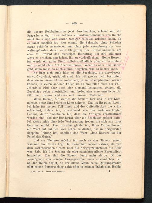 Und ein Weiteres möchte ich noch zu den Steuern sagen,was mir am Herzen liegt. Im Dezember vorigen Jahres, als vondem vorbereitenden Gesetz über die Kriegsgewinnsteuer die Redewar, habe ich die Steuern als eine staatsbürgerliche Ehrenpflichtbezeichnet. Das sind die Steuern heute mehr als je. Ob derVermögende von seinem Kriegsgewinne einen ansehnlichen Teilan das Reich abgibt, ob der kleine Mann seine Quittungsmarkeoder seinen Portozuschlag zahlt oder in seinem Tabak dem Reiche