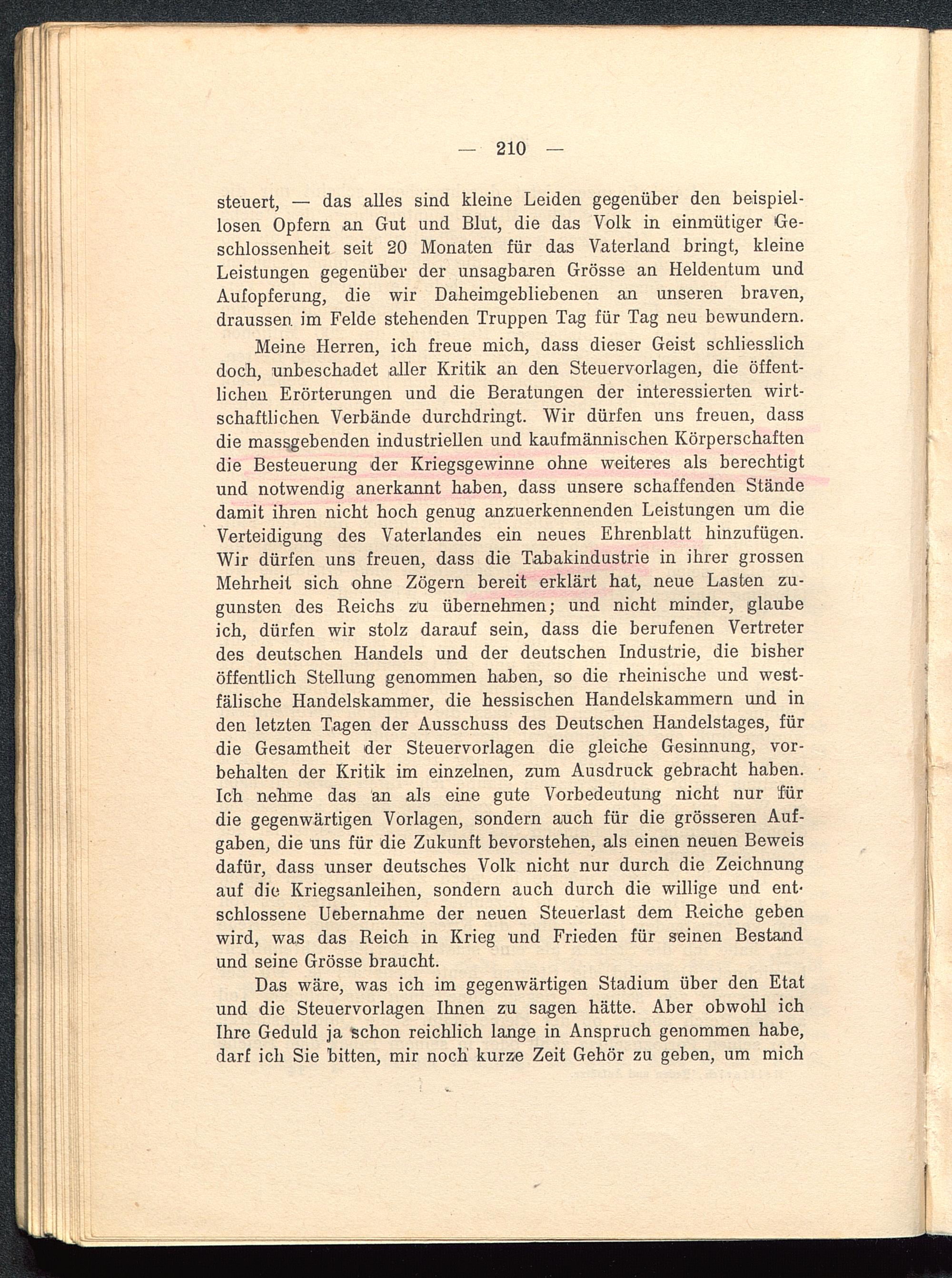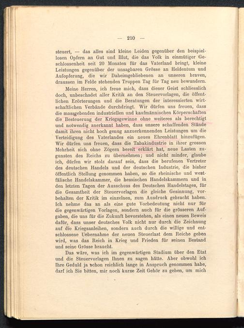 Meine Herren, ich freue mich, dass dieser Geist schliesslichdoch, unbeschadet aller Kritik an den Steuervorlagen, die öffent-lichen Erörterungen und die Beratungen der interessierten wirt-schaftlichen Verbände durchdringt. Wir dürfen uns freuen, dassdie massgebenden industriellen und kaufmännischen Körperschaftendie Besteuerung der Kriegsgewinne ohne weiteres als berechtigtund notwendig anerkannt haben, dass unsere schaffenden Ständedamit ihren nicht hoch genug anzuerkennenden Leistungen um dieVerteidigung des Vaterlandes ein neues Ehrenblatt hinzufügen.Wir dürfen uns freuen, dass die Tabakindustrie in ihrer grossenMehrheit sich ohne Zögern bereit erklärt hat, neue Lasten zu-gunsten des Beichs zu übernehmen; und nicht minder, glaubeich, dürfen wir stolz darauf sein, dass die berufenen Vertreterdes deutschen Handels und der deutschen Industrie, die bisheröffentlich Stellung genommen haben, so die rheinische und west-fälische Handelskammer, die hessischen Handelskammern und inden letzten Tagen der Ausschuss des Deutschen Handelstages, fürdie Gesamtheit der Steuervorlagen die gleiche Gesinnung, vor-behalten der Kritik im einzelnen, zum Ausdruck gebracht haben.Ich nehme das an als eine gute Vorbedeutung nicht nur fürdie gegenwärtigen Vorlagen, sondern auch für die grösseren Auf-gaben, die uns für die Zukunft bevorstehen, als einen neuen Beweisdafür, dass unser deutsches Volk nicht nur durch die Zeichnungauf die Kriegsanleihen, sondern auch durch die willige und ent-schlossene Uebernahme der neuen Steuerlast dem Beiche gebenwird, was das Beich in Krieg und Frieden für seinen Bestandund seine Grösse braucht.