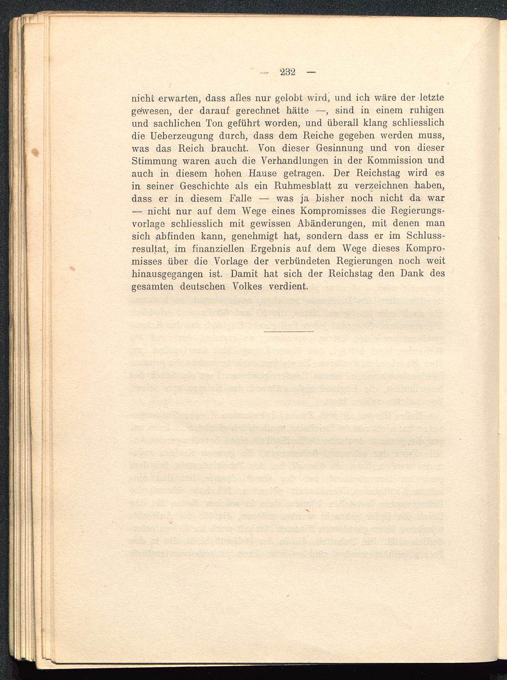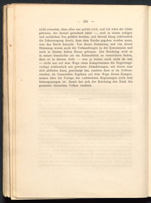 nicht erwarten, dass alles nur gelobt wird, und ich wäre der letztegewesen, der darauf gerechnet hätte —, sind in einem ruhigenund sachlichen Ton geführt worden, und überall klang schliesslichdie Ueberzeugung durch, dass dem Reiche gegeben werden muss,was das Reich braucht. Von dieser Gesinnung und von dieserStimmung waren auch die Verhandlungen in der Kommission undauch in diesem hohen Hause getragen. Der Reichstag wird esin seiner Geschichte als ein Ruhmesblatt zu verzeichnen haben,dass er in diesem Falle — was ja bisher noch nicht da war— nicht nur auf dem Wege eines Kompromisses die Regierungs-vorlage schliesslich mit gewissen Abänderungen, mit denen mansich abfinden kann, genehmigt hat, sondern dass er im Schluss-resultat, im finanziellen Ergebnis auf dem Wege dieses Kompro-misses über die Vorlage der verbündeten Regierungen noch weithinausgegangen ist. Damit hat sich der Reichstag den Dank desgesamten deutschen Volkes verdient.