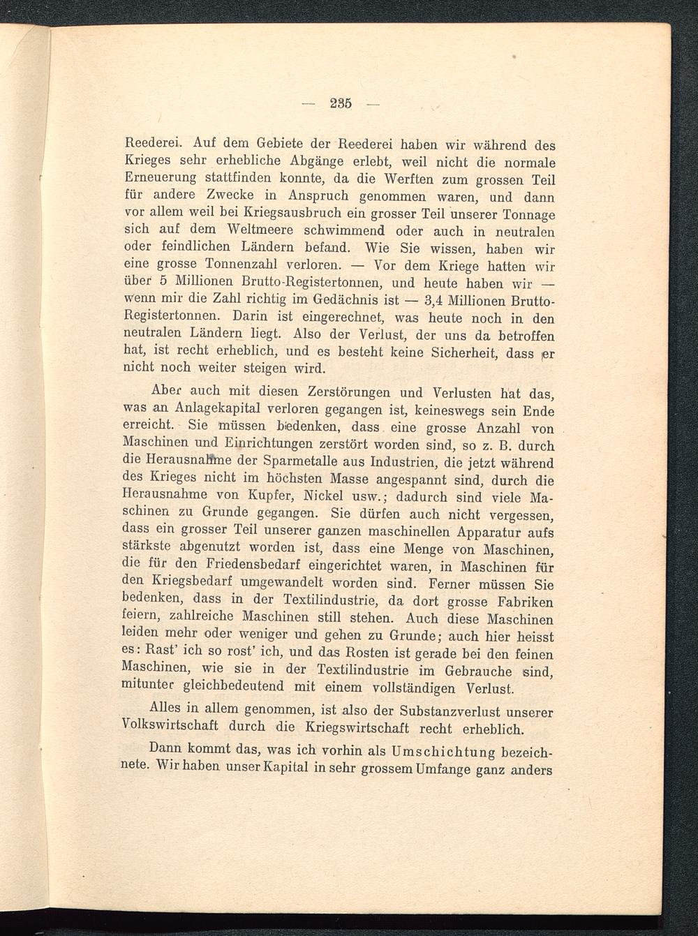 Reederei. Auf dem Gebiete der Reederei haben wir während desKrieges sehr erhebliche Abgänge erlebt, weil nicht die normaleErneuerung stattfinden konnte, da die Werften zum grossen Teilfür andere Zwecke in Anspruch genommen waren, und dannvor allem weil bei Kriegsausbruch ein grosser Teil unserer Tonnagesich auf dem Weltmeere schwimmend oder auch in neutralenoder feindlichen Ländern befand. Wie Sie wissen, haben wireine grosse Tonnenzahl verloren. — Vor dem Kriege hatten wirüber 5 Millionen Brutto-Registertonnen, und heute haben wir —wenn mir die Zahl richtig im Gedächnis ist — 3,4 Millionen Brutto-Registertonnen. Darin ist eingerechnet, was heute noch in denneutralen Ländern liegt. Also der Verlust, der uns da betroffenhat, ist recht erheblich, und es besteht keine Sicherheit, dass ernicht noch weiter steigen wird.