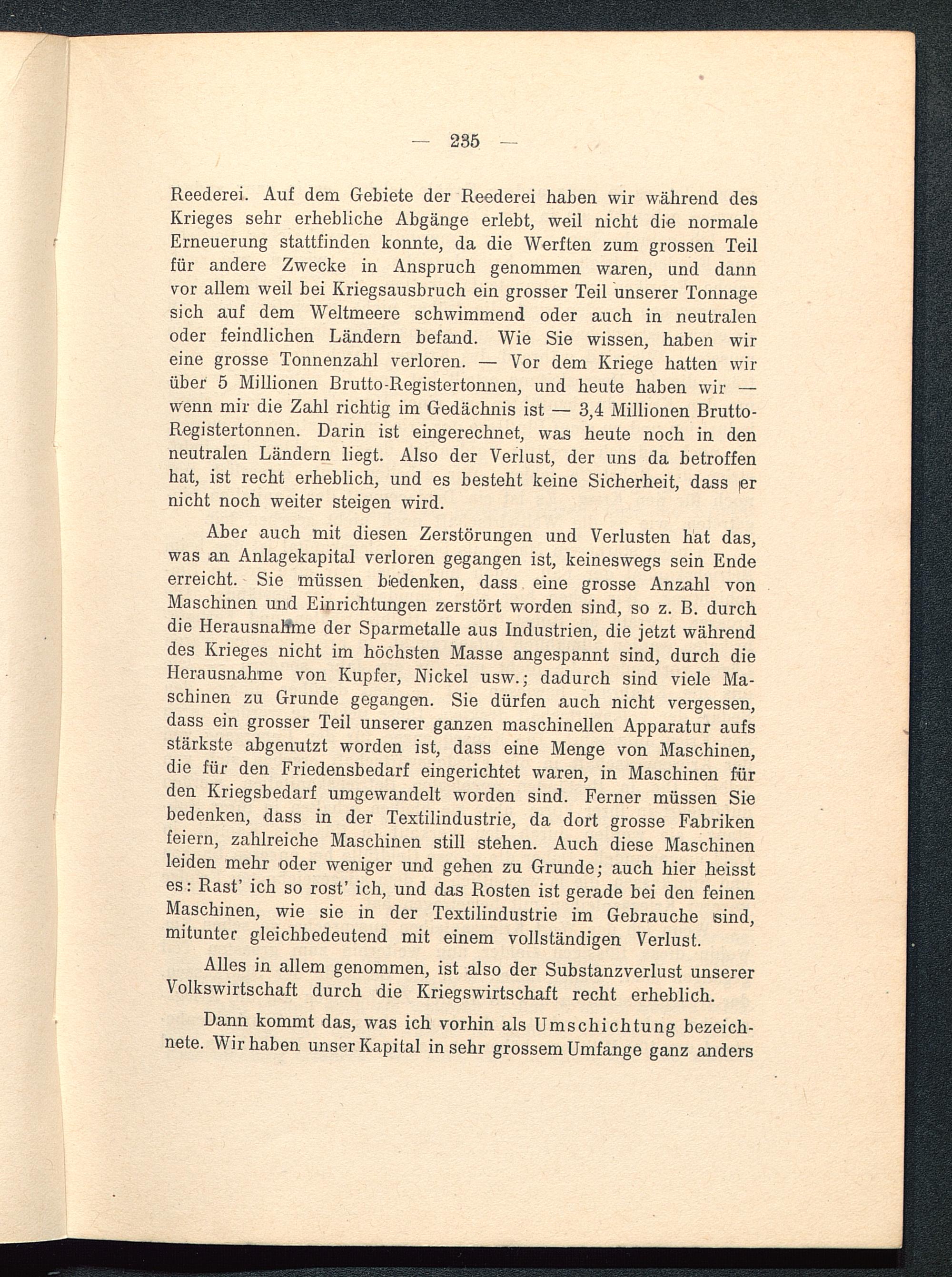 Aber auch mit diesen Zerstörungen und Verlusten hat das,was an Anlagekapital verloren gegangen ist, keineswegs sein Endeerreicht. Sie müssen bedenken, dass eine grosse Anzahl vonMaschinen und Einrichtungen zerstört worden sind, so z. B. durchdie Herausnahme der Sparmetalle aus Industrien, die jetzt währenddes Krieges nicht im höchsten Masse angespannt sind, durch dieHerausnahme von Kupfer, Nickel usw.; dadurch sind viele Ma-schinen zu Grunde gegangen. Sie dürfen auch nicht vergessen,dass ein grosser Teil unserer ganzen maschinellen Apparatur aufsstärkste abgenutzt worden ist, dass eine Menge von Maschinen,die für den Friedensbedarf eingerichtet waren, in Maschinen fürden Kriegsbedarf umgewandelt worden sind. Ferner müssen Siebedenken, dass in der Textilindustrie, da dort grosse Fabrikenfeiern, zahlreiche Maschinen still stehen. Auch diese Maschinenleiden mehr oder weniger und gehen zu Grunde; auch hier heisstes: Rast' ich so rost' ich, und das Rosten ist gerade bei den feinenMaschinen, wie sie in der Textilindustrie im Gebrauche sind,mitunter gleichbedeutend mit einem vollständigen Verlust.
