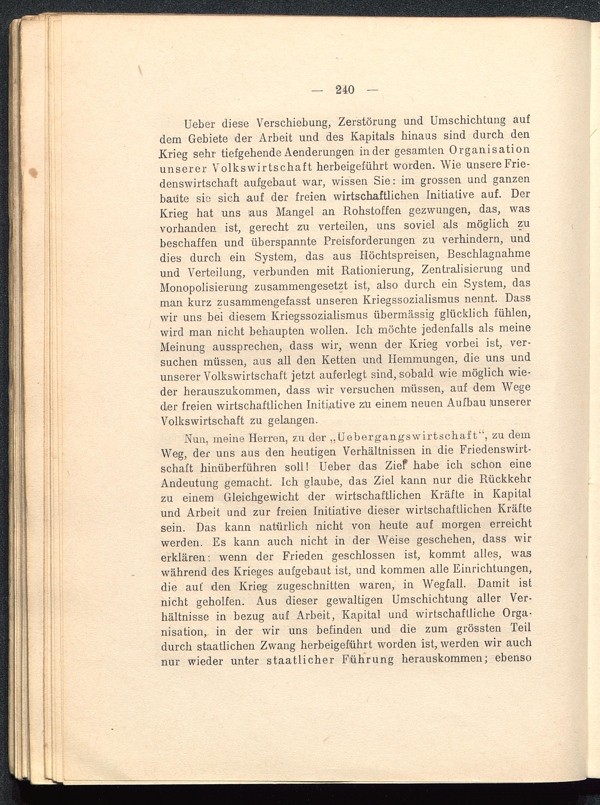 Ueber diese Verschiebung, Zerstörung und Umschichtung aufdem Gebiete der Arbeit und des Kapitals hinaus sind durch denKrieg sehr tiefgehende Aenderungen in der gesamten Organisationunserer Volkswirtschaft herbeigeführt worden. Wie unsere Frie-denswirtschaft aufgebaut war, wissen Sie: im grossen und ganzenbaute sie sich auf der freien wirtschaftlichen Initiative auf. DerKrieg hat uns laus Mangel an Rohstoffen gezwungen, das, wasvorhanden ist, gerecht zu verteilen, uns soviel als möglich zubeschaffen und überspannte Preisforderungen zu verhindern, unddies durch ein System, das aus Höchtspreisen, Beschlagnahmeund Verteilung, verbunden mit Rationierung, Zentralisierung undMonopolisierung zusammengesetzt ist, also durch ein System, dasman kurz zusammengefasst unseren Kriegssozialismus nennt. Dasswir uns bei diesem Kriegssozialismus übermässig glücklich fühlen,wird man nicht behaupten wollen. Ich möchte jedenfalls als meineMeinung aussprechen, dass wir, wenn der Krieg vorbei ist, ver-suchen müssen, aus all den Ketten und Hemmungen, die uns undunserer Volkswirtschaft jetzt auferlegt sind, sobald wie möglich wie-der herauszukommen, dass wir versuchen müssen, auf dem Wegeder freien wirtschaftlichen Initiative z.ü einem neuen Aufbau (unsererVolkswirtschaft zu gelangen.