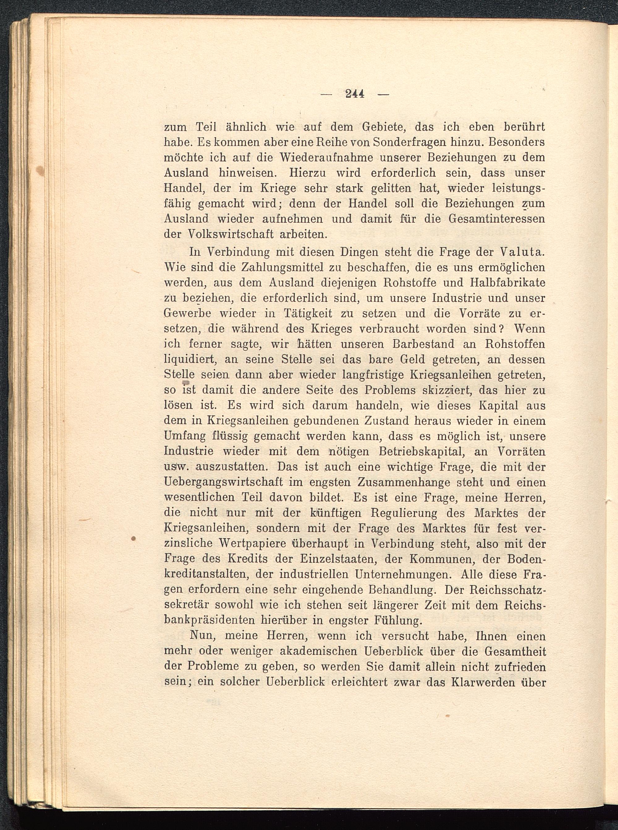 In Verbindung mit diesen Dingen steht die Frage der Valuta.Wie sind die Zahlungsmittel zu beschaffen, die es uns ermöglichenwerden, aus dem Ausland diejenigen Rohstoffe und Halbfabrikatezu beziehen, die erforderlich sind, um unsere Industrie und unserGewerbe wieder in Tätigkeit zu setzen und die Vorräte zu er-setzen, die während des Krieges verbraucht worden sind? Wennich ferner sagte, wir hätten unseren Barbestand an Rohstoffenliquidiert, an seine Stelle sei das bare Geld getreten, an dessenStelle seien dann aber wieder langfristige Kriegsanleihen getreten,so ist damit die andere Seite des Problems skizziert, das hier zulösen ist. Es wird sich darum handeln, wie dieses Kapital ausdem in Kriegsanleihen gebundenen Zustand heraus wieder in einemUmfang flüssig gemacht werden kann, dass es möglich ist, unsereIndustrie wieder mit dem nötigen Betriebskapital, an Vorrätenusw. auszustatten. Das ist auch eine wichtige Frage, die mit derUebergangswirtschaft im engsten Zusammenhange steht und einenwesentlichen Teil davon bildet. Es ist eine Frage, meine Herren,die nicht nur mit der künftigen Regulierung des Marktes derKriegsanleihen, sondern mit der Frage des Marktes für fest ver-zinsliche Wertpapiere überhaupt in Verbindung steht, also mit derFrage des Kredits der Einzelstaaten, der Kommunen, der Boden-kreditanstalten, der industriellen Unternehmungen. Alle diese Fra-gen erfordern eine sehr eingehende Behandlung. Der Reichsschatz-sekretär sowohl wie ich stehen seit längerer Zeit mit dem Reichs-bankpräsidenten hierüber in engster Fühlung.