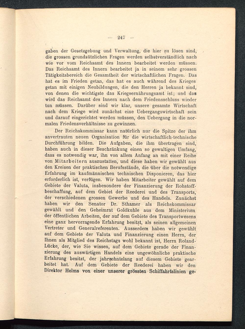 Der Reichskommissar kann natürlich nur die Spitze der ihmanvertrauten neuen Organisation für die wirtschaftlich-technischeDurchführung bilden. Die Aufgaben, die ihm übertragen sind,haben auch in dieser Beschränkung einen so gewaltigen Umfang,dass es notwendig war, ihn von allem Anfang an mit einer Reihevon Mitarbeitern auszustatten, und diese haben wir gewählt ausden Kreisen der praktischen Berufsstände, die über die notwendigeErfahrung im kaufmännischen technischen Disponieren, das hiererforderlich ist, verfügen. Wir haben Mitarbeiter gewählt auf demGebiete der Valuta, insbesondere der Finanzierung der Rohstoff-beschaffung, auf dem Gebiet der Reederei und des Transports,der verschiedenen grossen Gewerbe und des Handels. Zunächsthaben wir den Senator Dr. Sthamer als Reichskommissargewählt und den Geheimrat Goldkuhle aus dem Ministeriumder öffentlichen Arbeiten, der auf dem Gebiete des Transportwesenseine ganz hervorragende Erfahrung besitzt, als seinen allgemeinenVertreter und Generalreferenten. Ausserdem haben wir gewähltauf dem Gebiete der Valuta und Finanzierung einen Herrn, derIhnen als Mitglied des Reichstags wohl bekannt ist, Herrn Roland-Lücke, der, wie Sie wissen, auf dem Gebiete gerade der Finan-zierung des auswärtigen Handels eine ungewöhnliche praktischeErfahrung besitzt, der jahrzehntelang auf diesem Gebiete gear-beitet hat. Auf dem Gebiete der Reederei haben wir denDirektor Helms von einer unserer grössten Schiffahrtslinien ge-