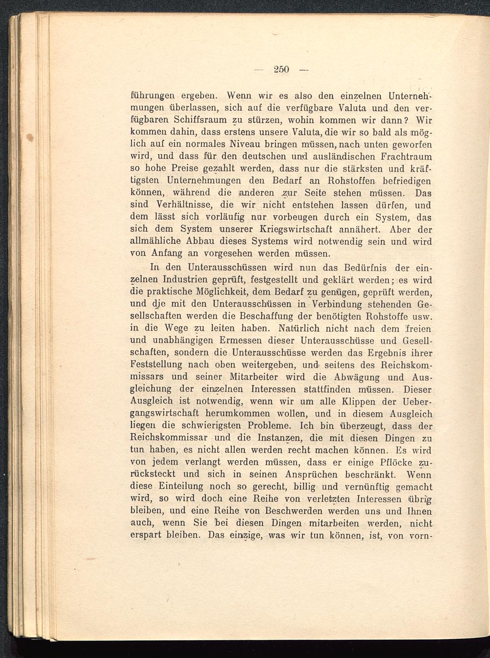 Führungen ergeben. Wenn wir es also den einzelnen Unterneh-mungen überlassen, sich auf die verfügbare Valuta und den ver-fügbaren Schiffsraum zu stürzen, wohin kommen wir dann? Wirkommen dahin, dass erstens unsere Valuta, die wir so bald als mög-lich auf ein normales Niveau bringen müssen, nach unten geworfenwird, und dass für den deutschen und ausländischen Frachtraumso hohe Preise gezahlt werden, dass nur die stärksten und kräf-tigsten Unternehmungen den Bedarf an Rohstoffen befriedigenkönnen, während die anderen ,zur Seite stehen müssen. Dassind Verhältnisse, die wir nicht entstehen lassen dürfen, unddem lässt sich vorläufig nur vorbeugen durch ein System, dassich dem System unserer Kriegswirtschaft annähert. Aber derallmähliche Abbau dieses Systems wird notwendig sein und wirdvon Anfang an vorgesehen werden müssen.
