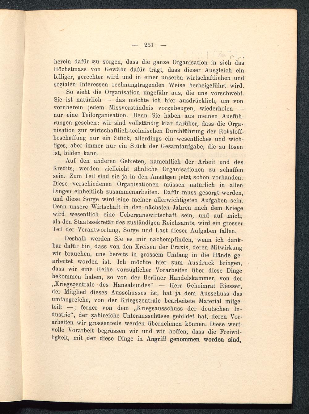 Deshalb werden Sie es mir nachempfinden, wenn ich dank-bar dafür bin, dass von den Kreisen der Praxis, deren Mitwirkungwir brauchen, uns bereits in grossem Umfang in die Hände ge-arbeitet worden ist. Ich möchte hier zum Ausdruck bringen,dass wir eine Reihe vorzüglicher Vorarbeiten über diese Dingebekommen haben, so von der Berliner Handelskammer, von der„Kriegszentrale des Hansabundes" — Herr Geheimrat Riesser,der Mitglied dieses Ausschusses ist, hat ja dem Ausschuss dasumfangreiche, von der Kriegszentrale bearbeitete Material mitge-teilt —; ferner von dem „Kriegsausschuss der deutschen In-dustrie", der zahlreiche Unterausschüsse gebildet hat, deren Vor-arbeiten wir grossenteils werden übernehmen können. Diese wert-volle Vorarbeit begrüssen wir und wir hoffen, dass die Freiwil-ligkeit, mit ( der diese Dinge in Angriff genommen worden sind,