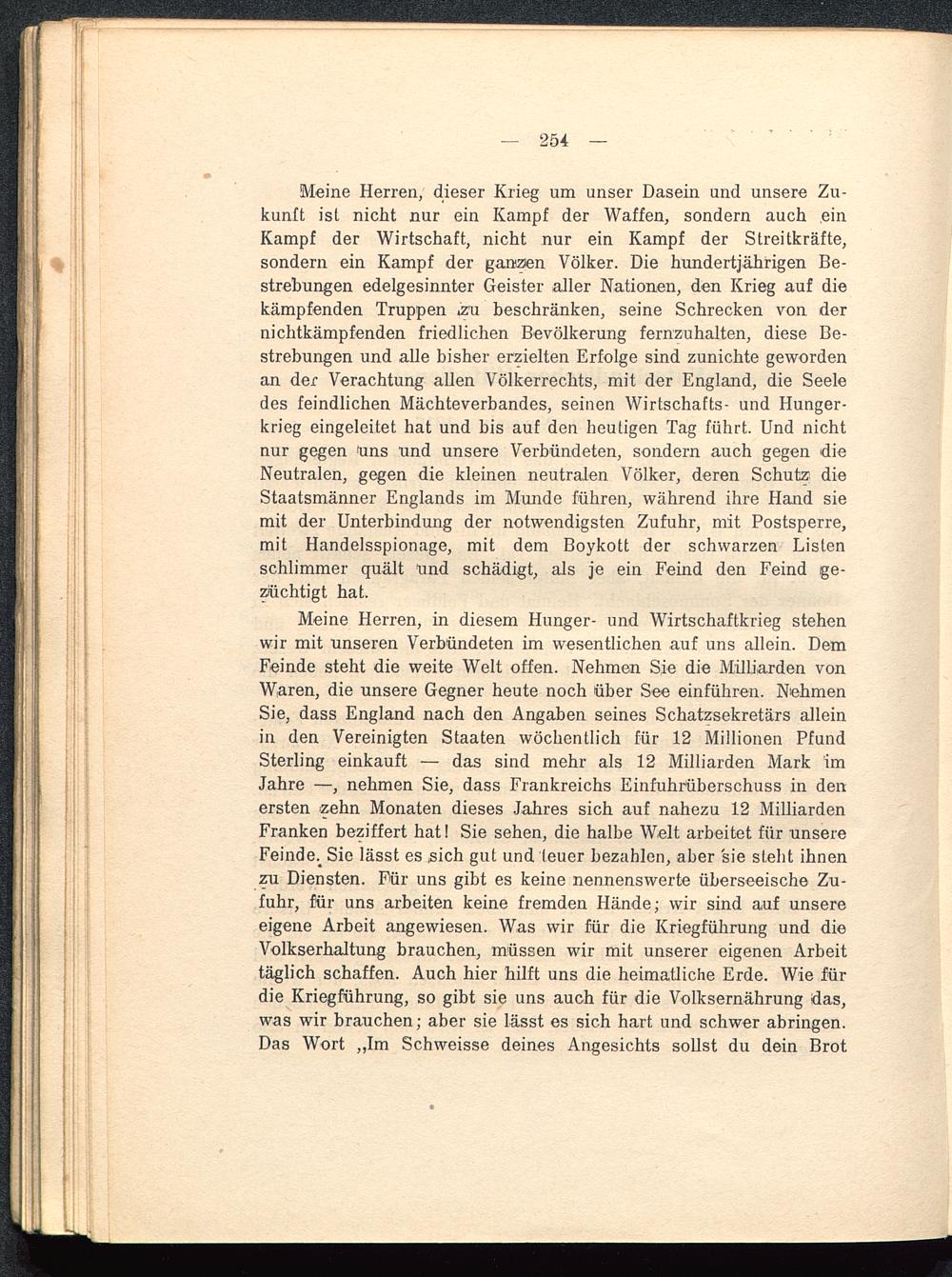 Meine Herren, in diesem Hunger- und Wirtschaftkrieg stehenwir mit unseren Verbündeten im wesentlichen auf uns allein. DemFeinde steht die weite Welt offen. Nehmen Sie die Milliarden vonWaren, die unsere Gegner heute noch über See einführen. NehmenSie, dass England nach den Angaben seines Schatzsekretärs alleinin den Vereinigten Staaten wöchentlich für 12 Millionen PfundSterling einkauft — das sind mehr als 12 Milliarden Mark imJahre —, nehmen Sie, dass Frankreichs Einfuhrüberschuss in denersten Kehn Monaten dieses Jahres sich auf nahezu 12 MilliardenFranken beziffert hat! Sie sehen, die halbe Welt arbeitet für unsereFeinde ; Sie lässt es .sich gut und leuer bezahlen, aber sie steht ihnenzu Diensten. Für uns gibt es keine nennenswerte überseeische Zu-fuhr, für uns arbeiten keine fremden Hände; wir sind auf unsereeigene Arbeit angewiesen. Was wir für die Kriegführung und dieVolkserhaltung brauchen, müssen wir mit unserer eigenen Arbeittäglich schaffen. Auch hier hilft uns die heimatliche Erde. Wie fürdie Kriegführung, so gibt sie uns auch für die Volksernährung das,was wir brauchen; aber sie lässt es sich hart und schwer abringen.Das Wort ,,Im Schweisse deines Angesichts sollst du dein Brot