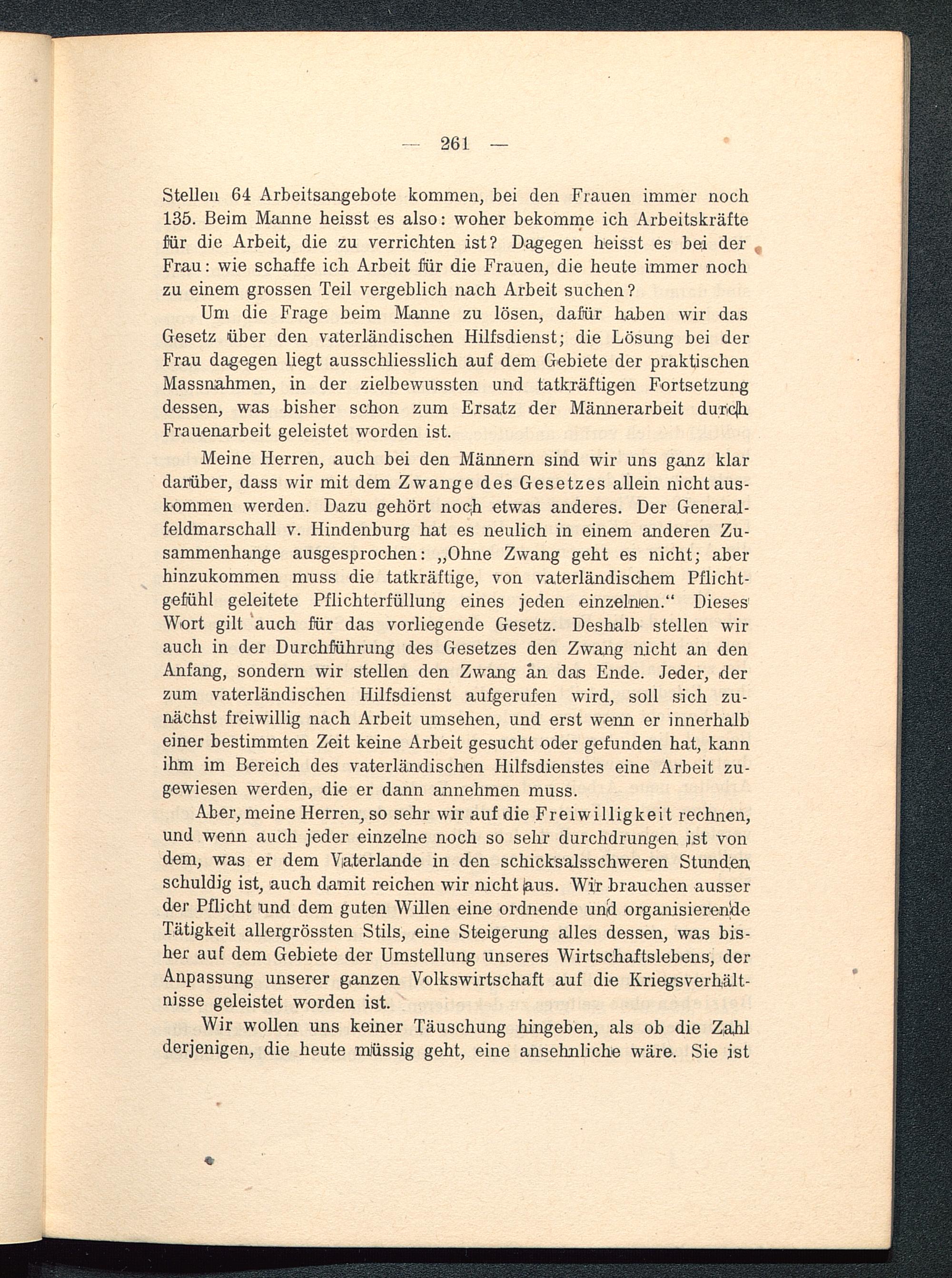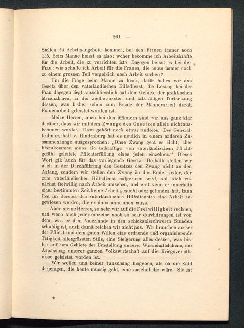 Um die Frage beim Manne zu lösen, dafür haben wir dasGesetz über den vaterländischen Hilfsdienst; die Lösung bei derFrau dagegen liegt ausschliesslich auf dem Gebiete der praktischenMassnahmen, in der zielbewussten und tatkräftigen Fortsetzungdessen, was bisher schon zum Ersatz der Männerarbeit duric|hFrauenarbeit geleistet worden ist.