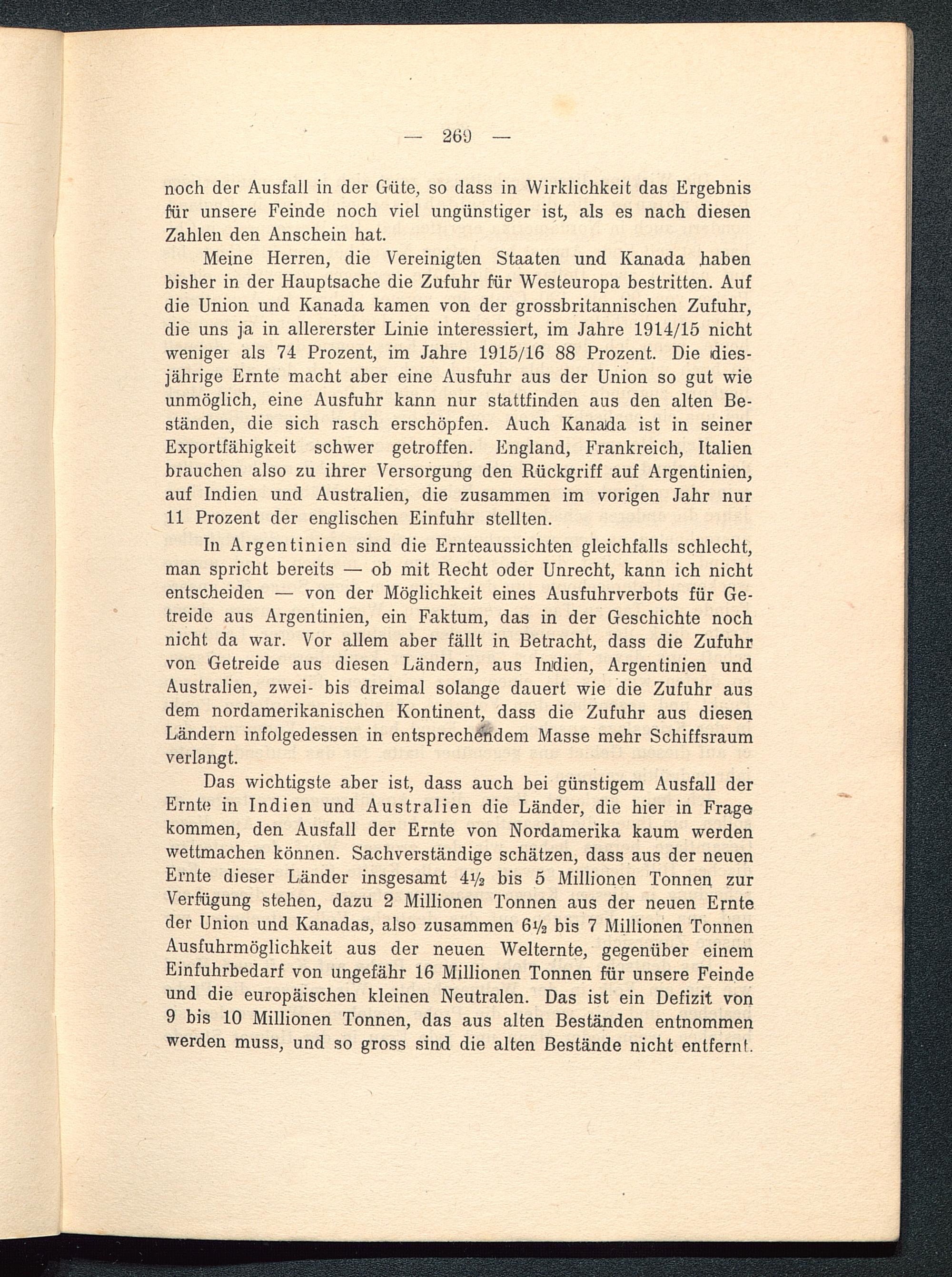 Das wichtigste aber ist, dass auch bei günstigem Ausfall derErnte in Indien und Australien die Länder, die hier in Fragekommen, den Ausfall der Ernte von Nordamerika kaum werdenwettmachen können. Sachverständige schätzen, dass aus der neuenErnte dieser Länder insgesamt 4y 3 bis 5 Millionen Tonnen zurVerfügung stehen, dazu 2 Millionen Tonnen aus der neuen Ernteder Union und Kanadas, also zusammen 6V2 bis 7 Millionen TonnenAusfuhrmöglichkeit aus der neuen Welternte, gegenüber einemEinfuhrbedarf von ungefähr 16 Millionen Tonnen für unsere Feindeund die europäischen kleinen Neutralen. Das ist ein Defizit von9 bis 10 Millionen Tonnen, das aus alten Beständen entnommenwerden muss, und so gross sind die alten Bestände nicht entfernt.