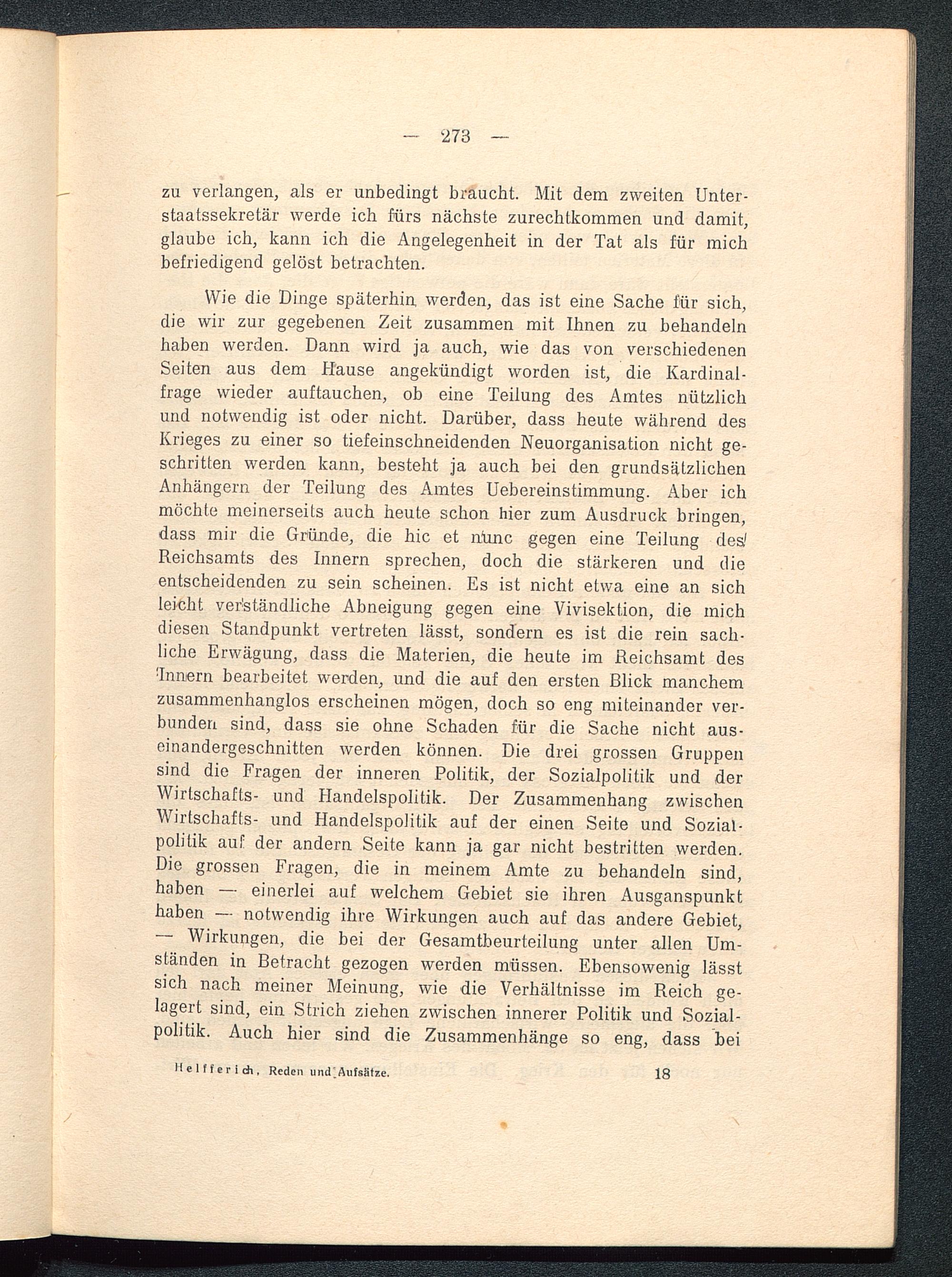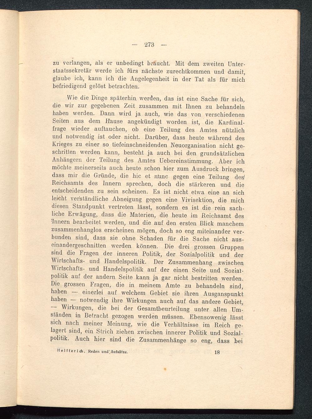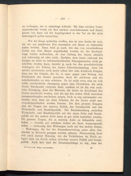 Wie die Dinge späterhin werden, das ist eine Sache für sich,die wir zur gegebenen Zeit zusammen mit Ihnen zu behandelnhaben werden. Dann wird ja auch, wie das von verschiedenenSeiten aus dem Hause angekündigt worden ist, die Kardinal-frage wieder auftauchen, ob eine Teilung des Amtes nützlichund notwendig ist oder nicht. Darüber, dass heute während desKrieges zu einer so tiefeinschneidenden Neuorganisation nicht ge-schritten werden kann, besteht ja auch bei den grundsätzlichenAnhängern der Teilung des Amtes Uebereinstimmung. Aber ichmöchte meinerseits auch heute schon hier zum Ausdruck bringen,dass mir die Gründe, die hic et nunc gegen eine Teilung des'Reichsamts des Innern sprechen, doch die stärkeren und dieentscheidenden zu sein scheinen. Es ist nicht etwa eine an sichleicht verständliche Abneigung gegen eine Vivisektion, die michdiesen Standpunkt vertreten lässt, sondern es ist die rein sach-liche Erwägung, dass die Materien, die heute im Reichsamt des'Innern bearbeitet werden, und die auf den ersten Rlick manchemzusammenhanglos erscheinen mögen, doch so eng miteinander ver-bunden sind, dass sie ohne Schaden für die Sache nicht aus-einandergeschnitten werden können. Die drei grossen Gruppensind die Fragen der inneren Politik, der Sozialpolitik und derWirtschafts- und Handelspolitik. Der Zusammenhang zwischenWirtschafts- und Handelspolitik auf der einen Seite und Sozial-politik auf der andern Seite kann ja gar nicht bestritten werden.Die grossen Fragen, die in meinem Amte zu behandeln sind,haben — einerlei auf welchem Gebiet sie ihren Ausganspunkthaben — notwendig ihre Wirkungen auch auf das andere Gebiet,— Wirkungen, die bei der Gesamtbeurteilung unter allen Um-ständen in Betracht gezogen werden müssen. Ebensowenig lässtsich nach meiner Meinung, wie die Verhältnisse im Reich ge-lagert sind, ein Strich ziehen zwischen innerer Politik und Sozial-politik. Auch hier sind die Zusammenhänge so eng, dass bei