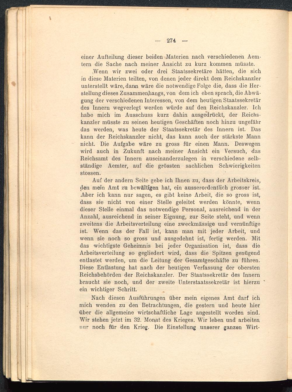 Wenn wir zwei oder drei Staatssekretäre hätten, die sichin diese Materien teilten, von denen jeder direkt dem Reichskanzlerunterstellt wäre, dann wäre die notwendige Folge die, dass die Her-stellung dieses Zusammenhangs, von dem ich eben sprach, die Abwä-gung der verschiedenen Interessen, von dem heutigen Staatssekretärdes Innern wegverlegt werden würde auf den Reichskanzler. Ichhabe mich im Ausschuss kurz dahin ausgedrückt, der Reichs-kanzler müsste zu seinen heutigen Geschäften noch hinzu ungefährdas werden, was heute der Staatssekretär des Innern ist. Daskann der Reichskanzler nicht, das kann auch der stärkste Mannnicht. Die Aufgabe wäre zu gross für einen Mann. Deswegenwird auch in Zukunft nach meiner Ansicht ein Versuch, dasReichsamt des Innern auseinanderzulegen in verschiedene selb-ständige Aemter, auf die grössten sachlichen Schwierigkeitenstossen.