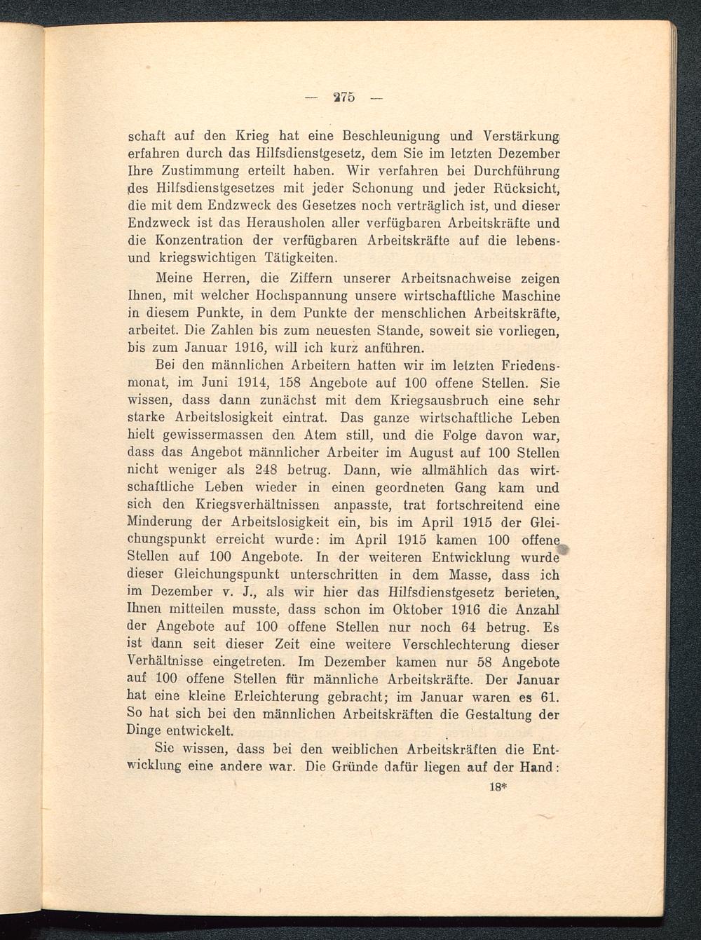 Bei den männlichen Arbeitern hatten wir im letzten Friedens-monat, im Juni 1914, 158 Angebote auf 100 offene Stellen. Siewissen, dass dann zunächst mit dem Kriegsausbruch eine sehrstarke Arbeitslosigkeit eintrat. Das ganze wirtschaftliche Lebenhielt gewissermassen den Atem still, und die Folge davon war,dass das Angebot männlicher Arbeiter im August auf 100 Stellennicht weniger als 248 betrug. Dann, wie allmählich das wirt-schaftliche Leben wieder in einen geordneten Gang kam undsich den Kriegsverhältnissen anpasste, trat fortschreitend eineMinderung der Arbeitslosigkeit ein, bis im April 1915 der Glei-chungspunkt erreicht wurde: im April 1915 kamen 100 offene.Stellen auf 100 Angebote. In der weiteren Entwicklung wurdedieser Gleichungspunkt unterschritten in dem Masse, dass ichim Dezember v. J., als wir hier das Hilfsdienstgesetz berieten,Ihnen mitteilen musste, dass schon im Oktober 1916 die Anzahlder Angebote auf 100 offene Stellen nur noch 64 betrug. Esist dann seit dieser Zeit eine weitere Verschlechterung dieserVerhältnisse eingetreten. Im Dezember kamen nur 58 Angeboteauf 100 offene Stellen für männliche Arbeitskräfte. Der Januarhat eine kleine Erleichterung gebracht; im Januar waren es 61.So hat sich bei den männlichen Arbeitskräften die Gestaltung derDinge entwickelt.