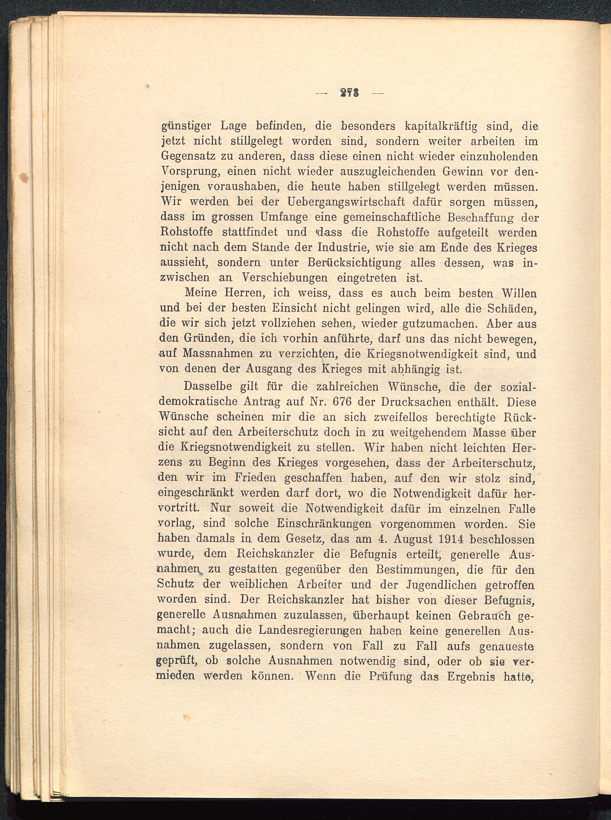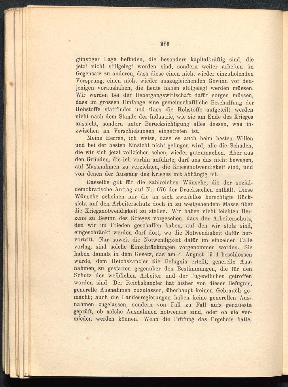 Meine Herren, ich weiss, dass es auch beim besten Willenund bei der besten Einsicht nicht gelingen wird, alle die Schäden,die wir sich jetzt vollziehen sehen, wieder gutzumachen. Aber ausden Gründen, die ich vorhin anführte, darf uns das nicht bewegen,auf Massnahmen zu verzichten, die Kriegsnotwendigkeit sind, undvon denen der Ausgang des Krieges mit abhängig ist.