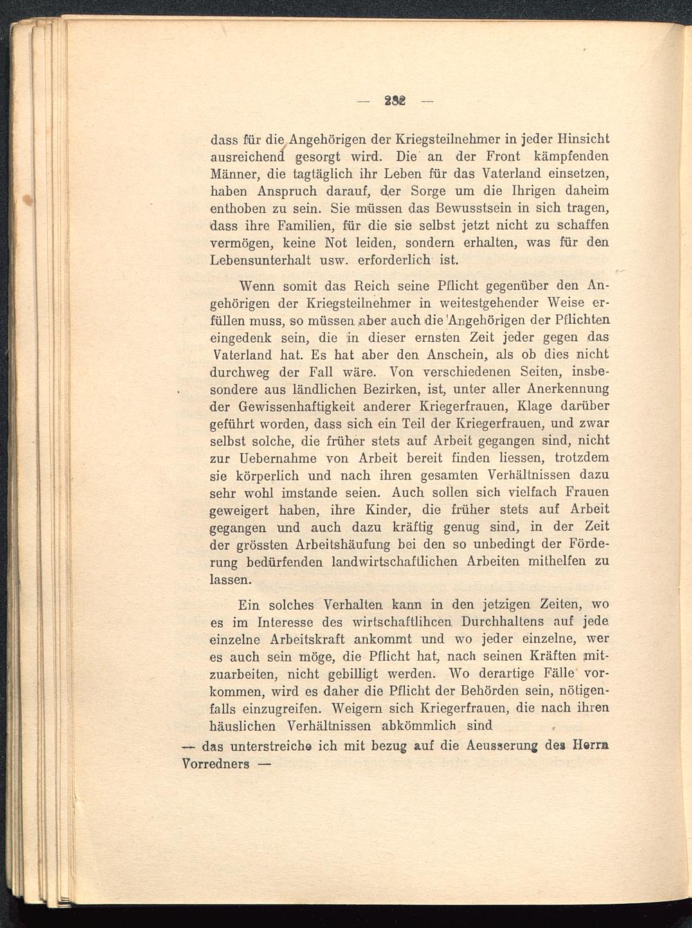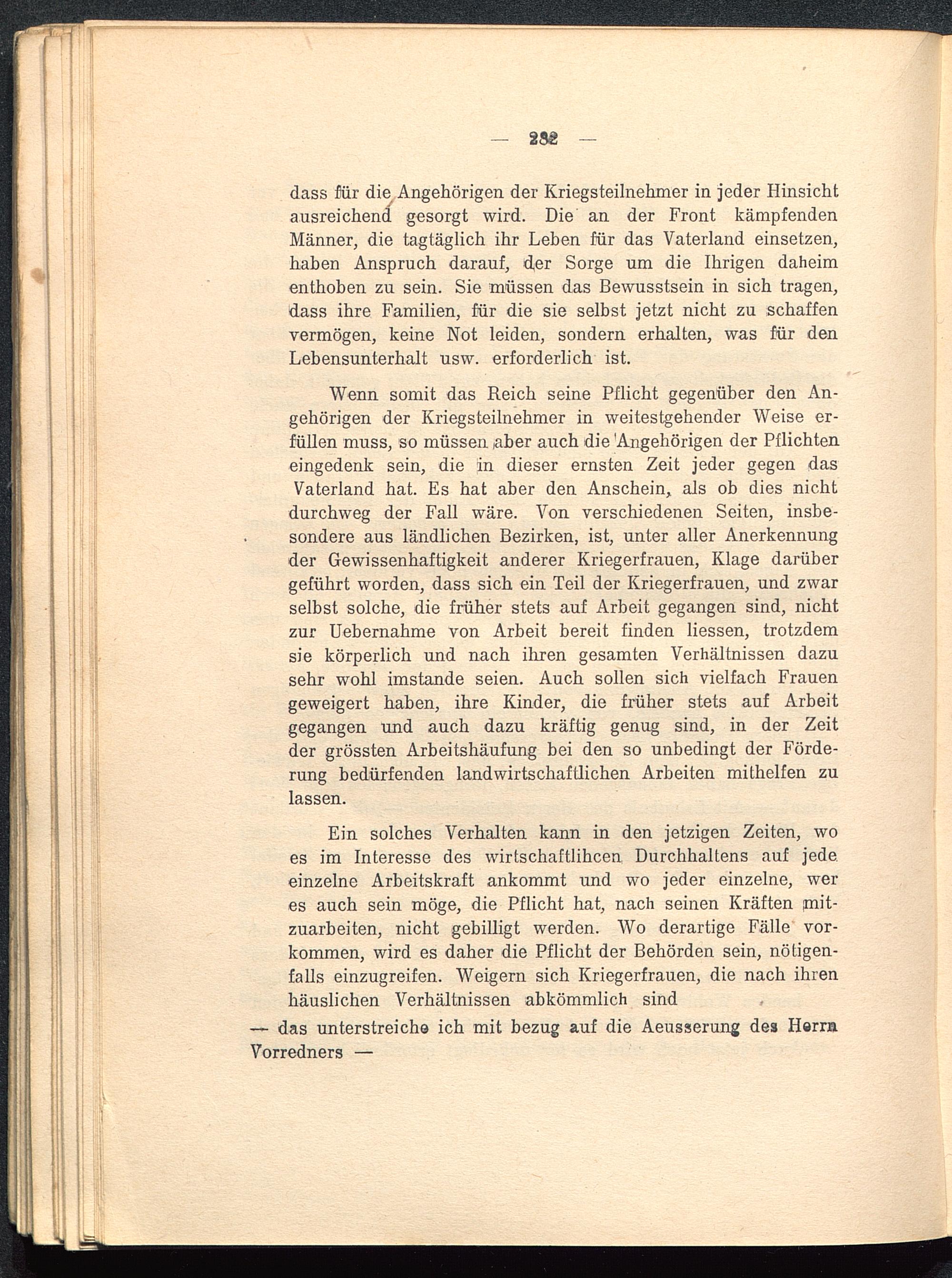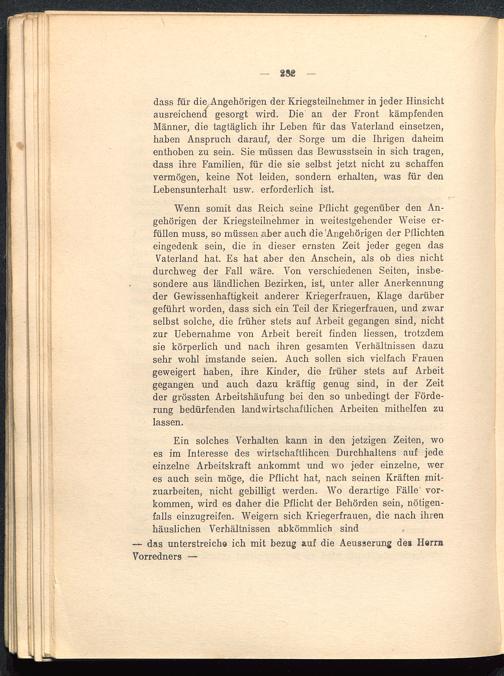 dass für die Angehörigen der Kriegsteilnehmer in jeder Hinsichtausreichend gesorgt wird. Die an der Front kämpfendenMänner, die tagtäglich ihr Leben für das Vaterland einsetzen,haben Anspruch darauf, der Sorge um die Ihrigen daheimenthoben zu sein. Sie müssen das Bewusstsein in sich tragen,dass ihre Familien, für die sie selbst jetzt nicht zu schaffenvermögen, keine Not leiden, sondern erhalten, was für denLebensunterhalt usw. erforderlich ist.