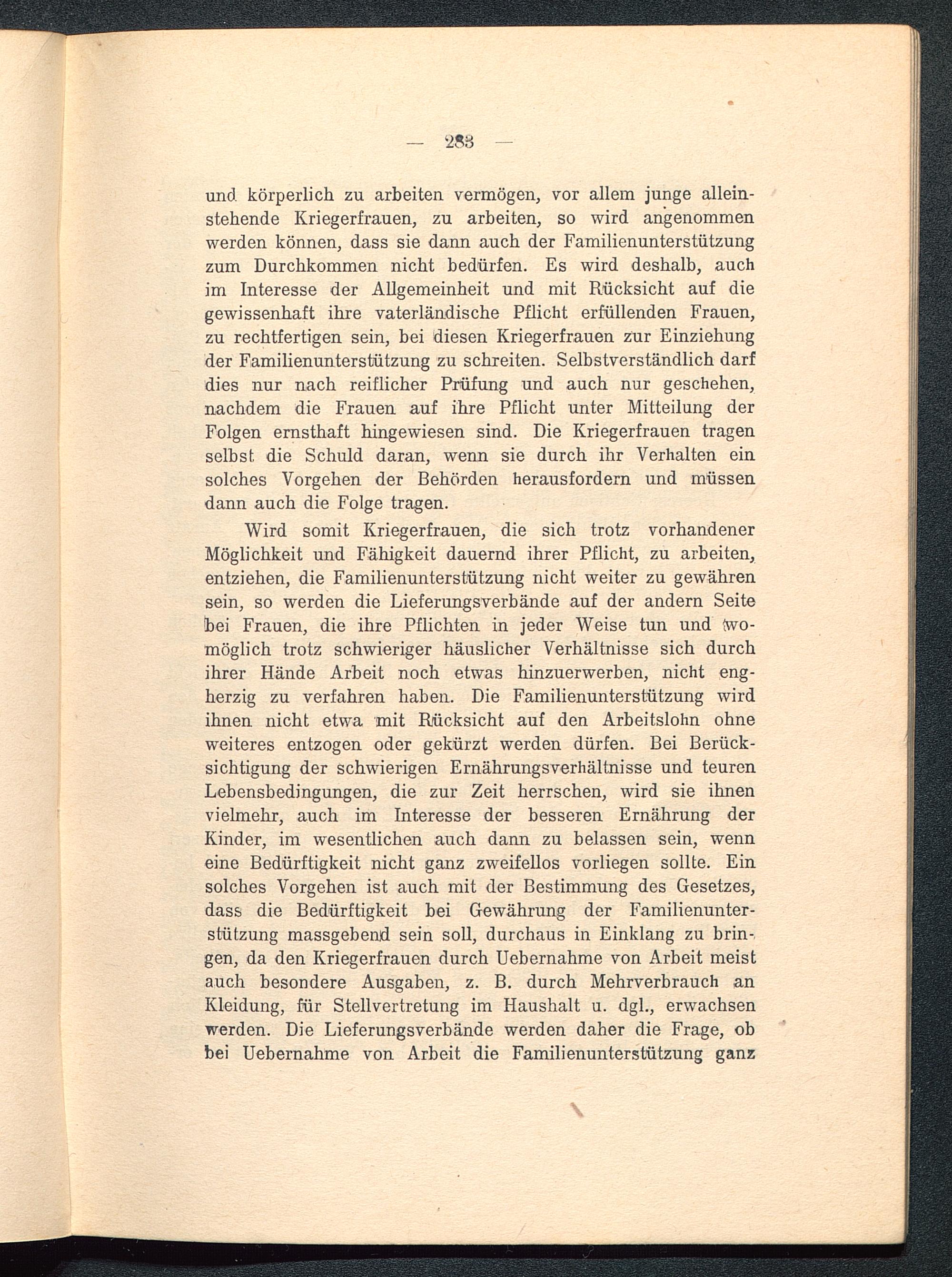 und körperlich zu arbeiten vermögen, vor allem junge allein-stehende Kriegerfrauen, zu arbeiten, so wird angenommenwerden können, dass sie dann auch der Familienunterstützungzum Durchkommen nicht bedürfen. Es wird deshalb, auchim Interesse der Allgemeinheit und mit Rücksicht auf diegewissenhaft ihre vaterländische Pflicht erfüllenden Frauen,zu rechtfertigen sein, bei diesen Kriegerfrauen zur Einziehungder Familienunterstützung zu schreiten. Selbstverständlich darfdies nur nach reiflicher Prüfung und auch nur geschehen,nachdem die Frauen auf ihre Pflicht unter Mitteilung derFolgen ernsthaft hingewiesen sind. Die Kriegerfrauen tragenselbst die Schuld daran, wenn sie durch ihr Verhalten einsolches Vorgehen der Behörden herausfordern und müssendann auch die Folge tragen.