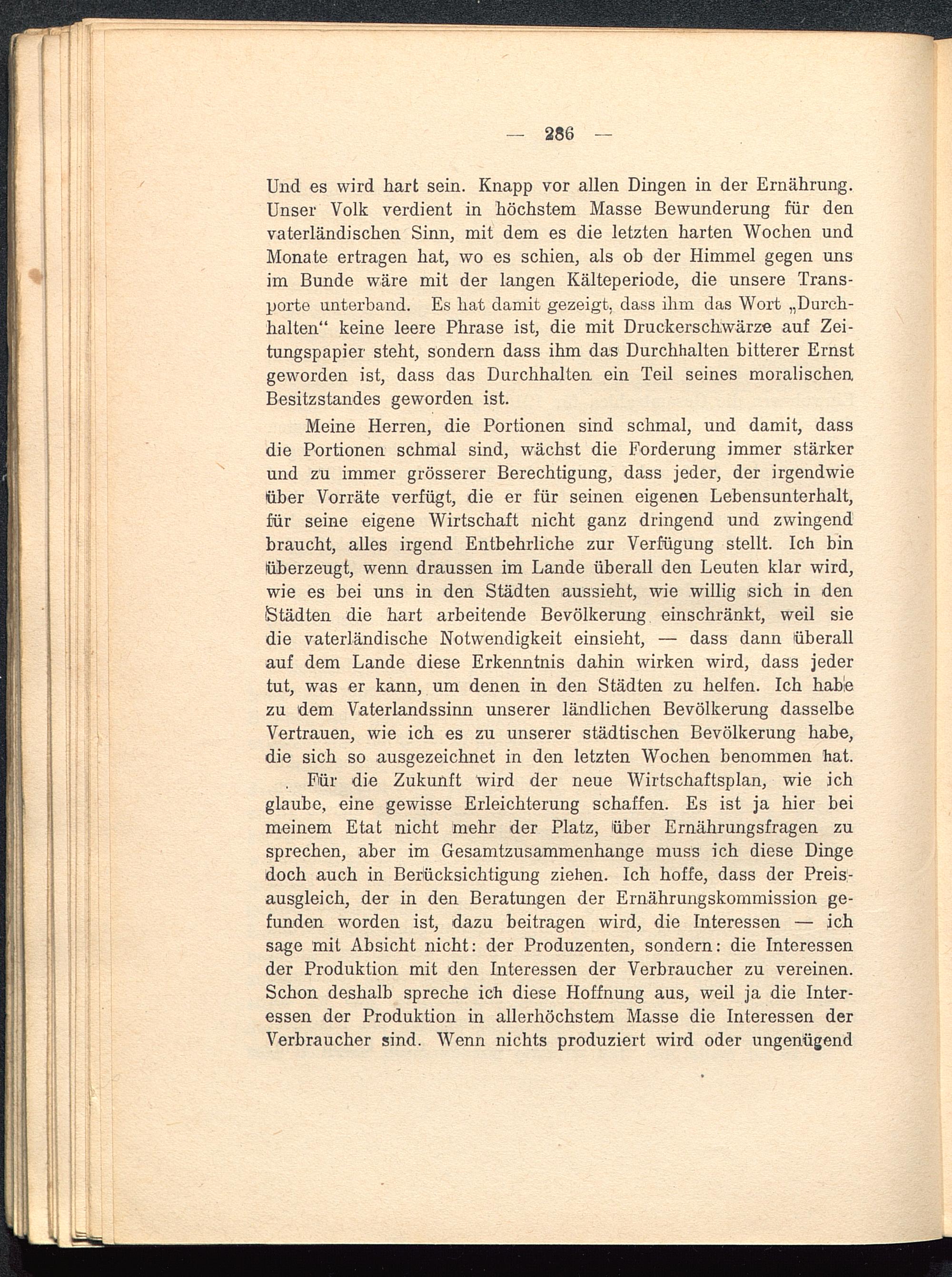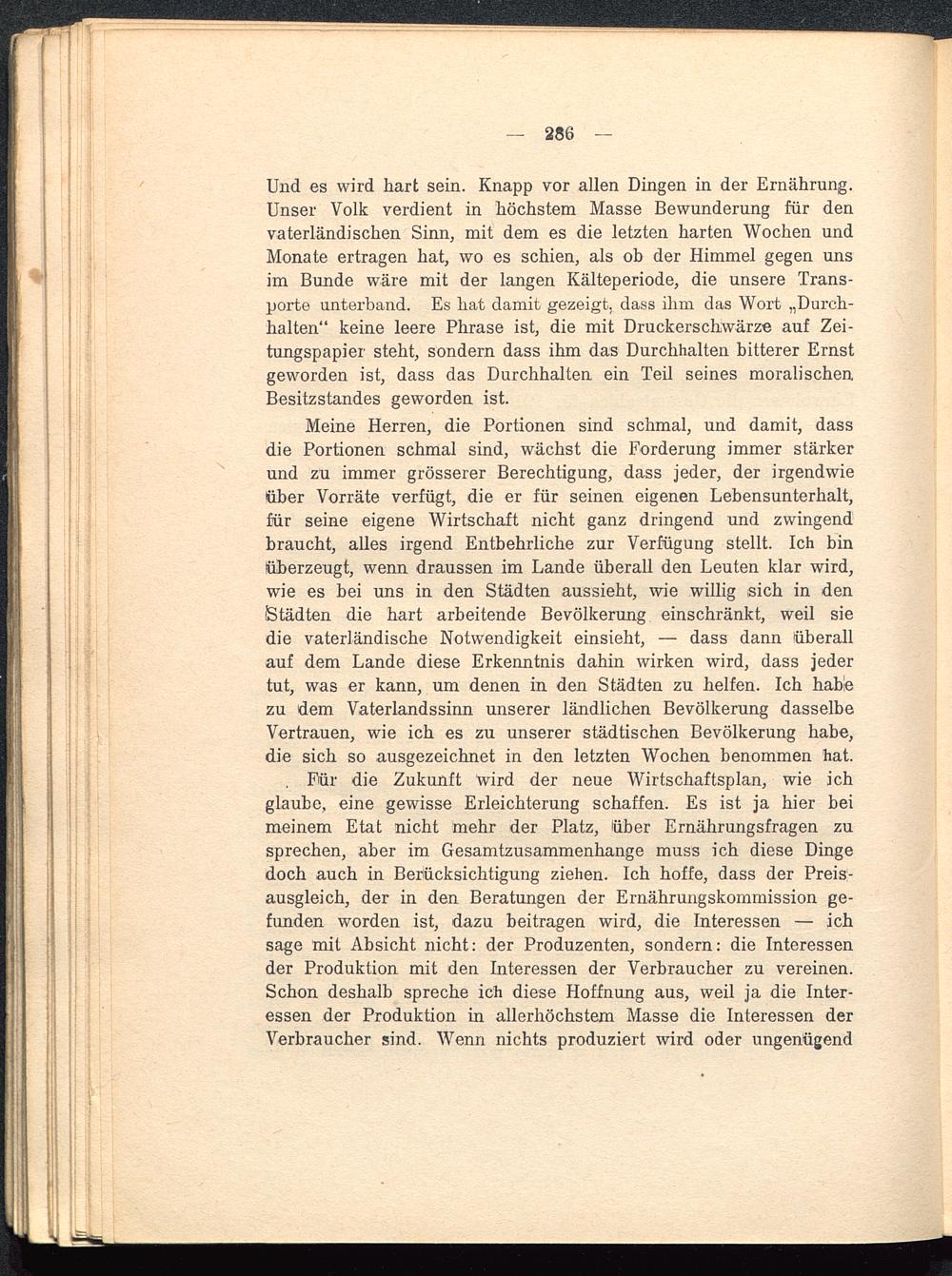 Und es wird hart sein. Knapp vor allen Dingen in der Ernährung.Unser Volk verdient in höchstem Masse Bewunderung für denvaterländischen Sinn, mit dem es die letzten harten Wochen undMonate ertragen hat, wo es schien, als ob der Himmel gegen unsim Bunde wäre mit der langen Kälteperiode, die unsere Trans-porte unterband. Es hat damit gezeigt, dass ihm das Wort „Durch-halten" keine leere Phrase ist, die mit Druckerschwärze auf Zei-tungspapier steht, sondern dass ihm das Durchhalten bitterer Ernstgeworden ist, dass das Durchhalten, ein Teil seines moralischenBesitzstandes geworden ist.