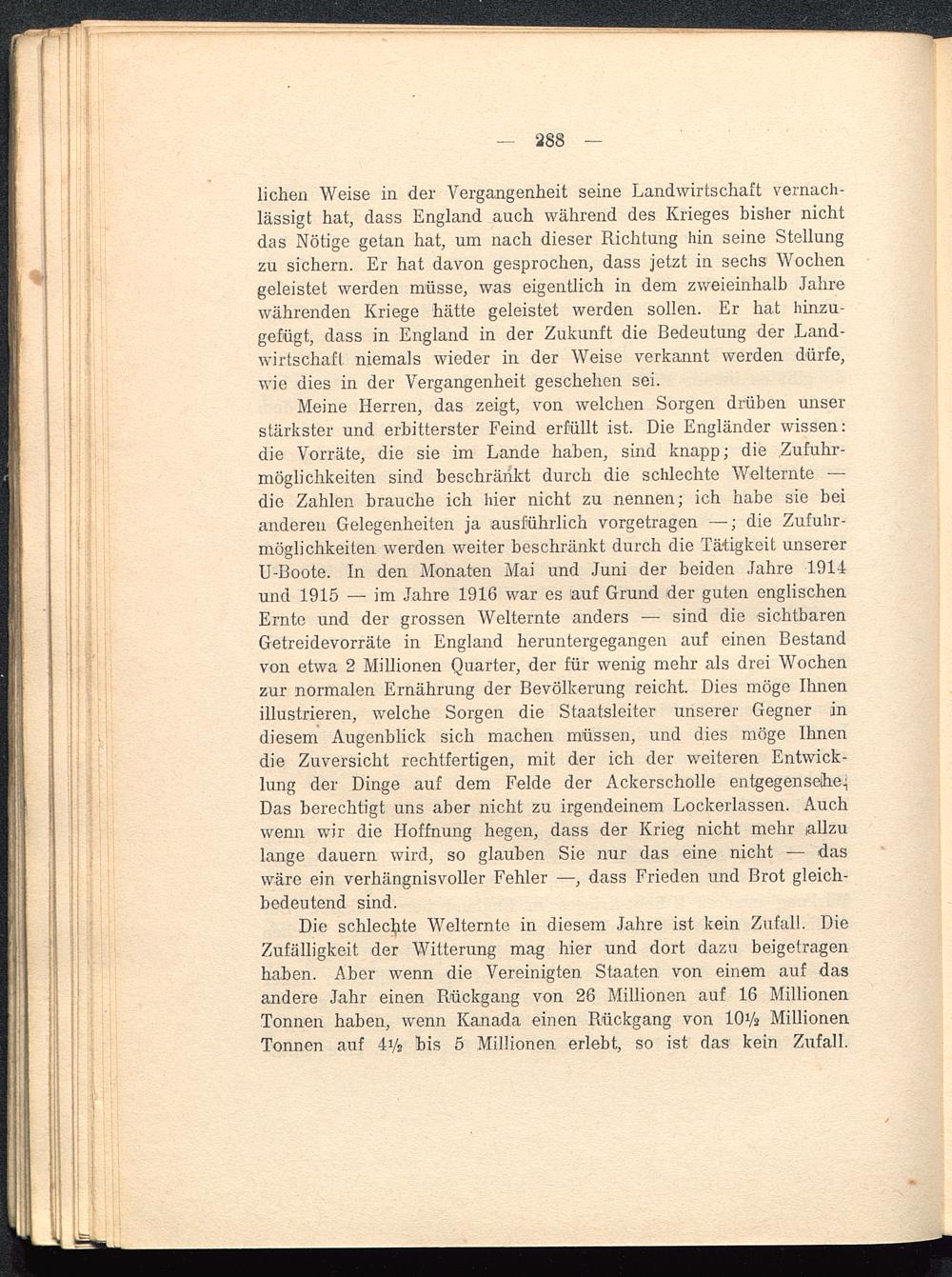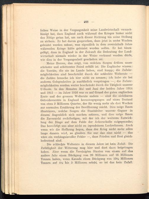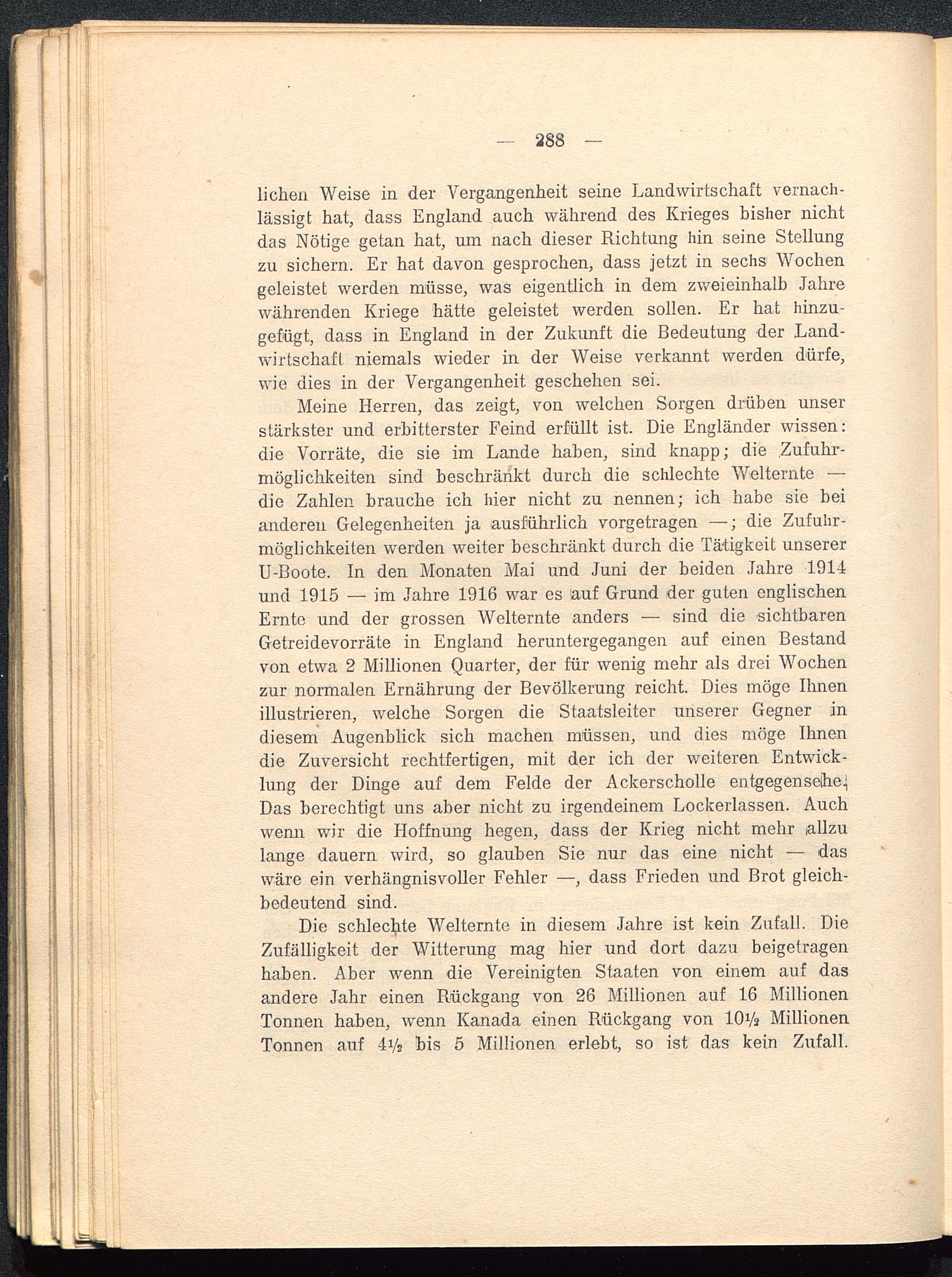 Meine Herren, das zeigt, von welchen Sorgen drüben unserstärkster und erbitterster Feind erfüllt ist. Die Engländer wissen:die Vorräte, die sie im Lande haben, sind knapp; die Zufuhr-möglichkeiten sind beschränkt durch die schlechte Welternte —die Zahlen brauche ich hier nicht zu nennen; ich habe sie beianderen Gelegenheiten ja ausführlich vorgetragen —; die Zufuhr-möglichkeiten werden weiter beschränkt durch die Tätigkeit unsererU-Boote. In den Monaten Mai und Juni der beiden Jahre 191-4und 1915 — im Jahre 1916 war es auf Grund der guten englischenErnte und der grossen Welternte anders — sind die sichtbarenGetreidevorräte in England heruntergegangen auf einen Bestandvon etwa 2 Millionen Quarter, der für wenig mehr als drei Wochenzur normalen Ernährung der Bevölkerung reicht. Dies möge Ihnenillustrieren, welche Sorgen die Staatsleiter unserer Gegner indiesem Augenblick sich machen müssen, und dies möge Ihnendie Zuversicht rechtfertigen, mit der ich der weiteren Entwick-lung der Dinge auf dem Felde der Ackerscholle entgegensehe.;Das berechtigt uns aber nicht zu irgendeinem Lockerlassen. Auchwenn wir die Hoffnung hegen, dass der Krieg nicht mehr iallzulange dauern wird, so glauben Sie nur das eine nicht — daswäre ein verhängnisvoller Fehler —■, dass Frieden und Brot gleich-bedeutend sind.