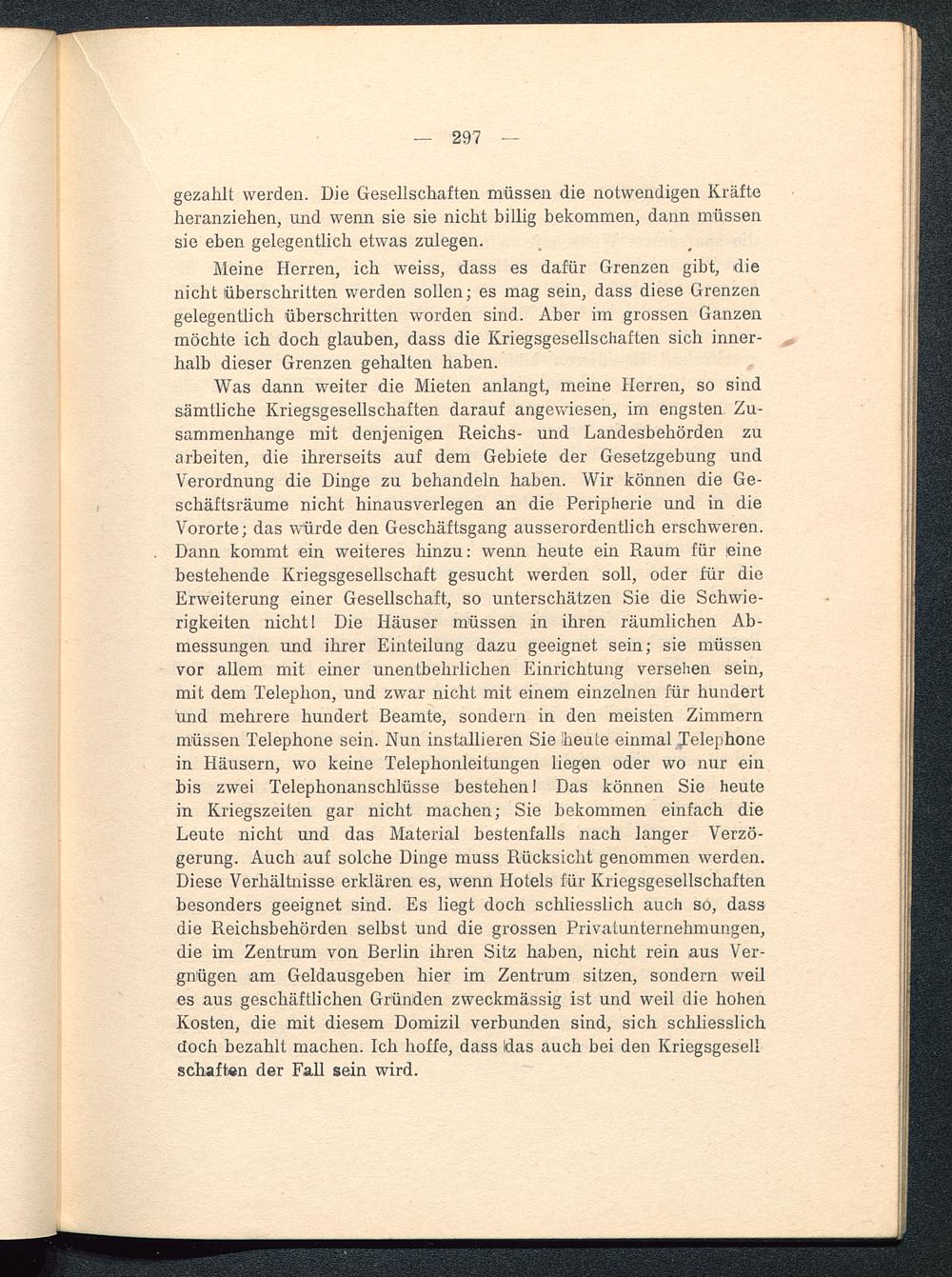 Was dann weiter die Mieten anlangt, meine Herren, so sindsämtliche Kriegsgesellschaften darauf angewiesen, im engsten Zu-sammenhange mit denjenigen Reichs- und Landesbehörden zuarbeiten, die ihrerseits auf dem Gebiete der Gesetzgebung undVerordnung die Dinge zu behandeln haben. Wir können die Ge-schäftsräume nicht hinausverlegen an die Peripherie und in dieVororte; das würde den Geschäftsgang ausserordentlich erschweren.Dann kommt ein weiteres hinzu: wenn heute ein Raum für einebestehende Kriegsgesellschaft gesucht werden soll, oder für dieErweiterung einer Gesellschaft, so unterschätzen Sie die Schwie-rigkeiten nicht! Die Häuser müssen in ihren räumlichen Ab-messungen und ihrer Einteilung dazu geeignet sein; sie müssenvor allem mit einer unentbehrlichen Einrichtung versehen sein,mit dem Telephon, und zwar nicht mit einem einzelnen für hundertund mehrere hundert Beamte, sondern in den meisten Zimmernmüssen Telephone sein. Nun installieren Sie heute einmal Telephonein Häusern, wo keine Telephonleitungen liegen oder wo nur einbis zwei Telephonanschlüsse bestehen I Das können Sie heutein Kriegszeiten gar nicht machen; Sie bekommen einfach dieLeute nicht und das Material bestenfalls nach langer Verzö-gerung. Auch auf solche Dinge muss Rücksicht genommen werden.Diese Verhältnisse erklären es, wenn Hotels für Kriegsgesellschaftenbesonders geeignet sind. Es liegt doch schliesslich auch so, dassdie Reichsbehörden selbst und die grossen Privatunternehmungen,die im Zentrum von Berlin ihren Sitz haben, nicht rein aus Ver-gnügen am Geldausgeben hier im Zentrum sitzen, sondern weiles aus geschäftlichen Gründen zweckmässig ist und weil die hohenKosten, die mit diesem Domizil verbunden sind, sich schliesslichdoch bezahlt machen. Ich hoffe, dass Idas auch bei den KriegsgesellSchäften der Fall sein wird.
