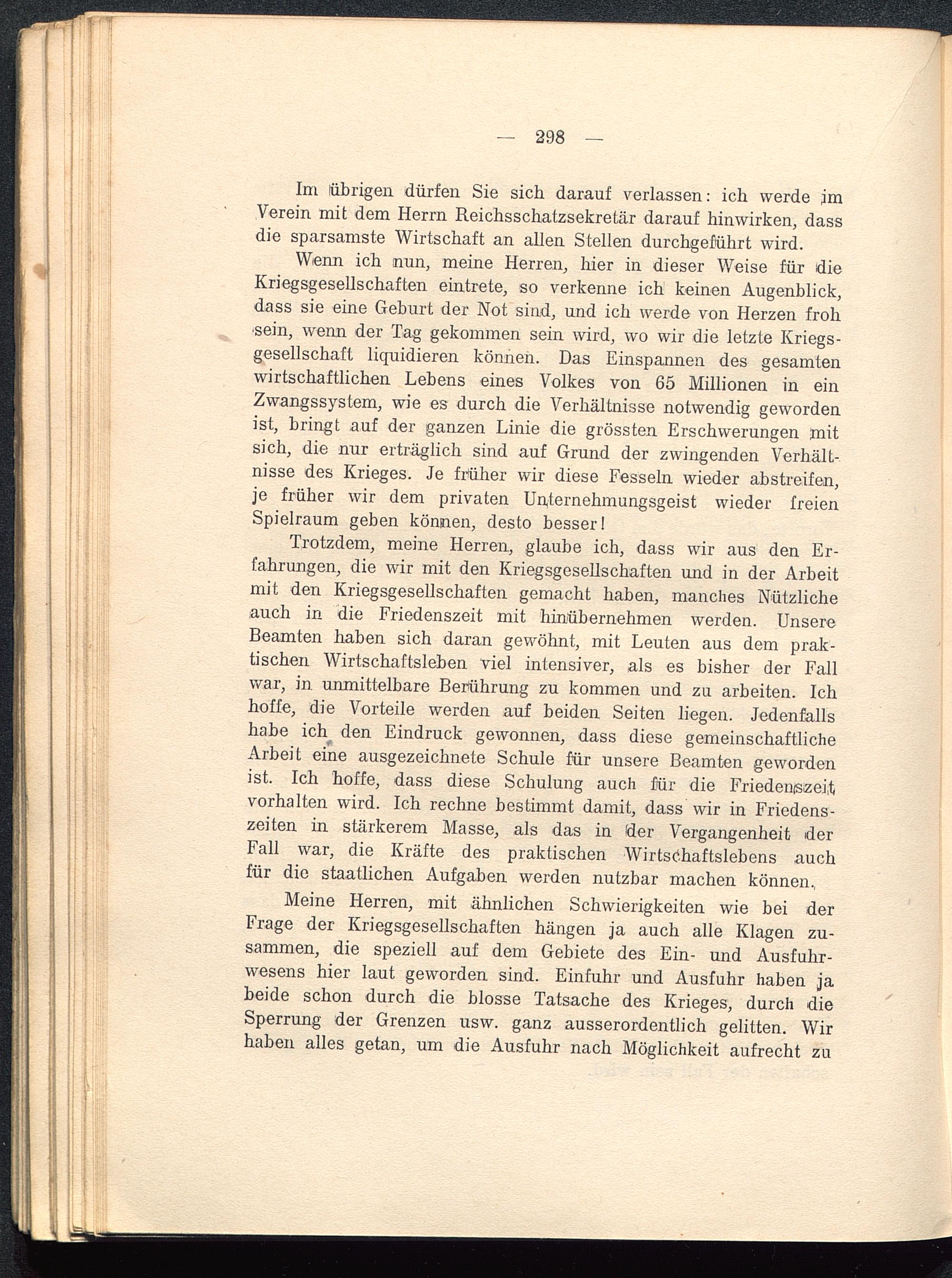 Wenn ich nun, meine Herren, hier in dieser Weise für dieKriegsgesellschaften eintrete, so verkenne ich keinen Augenblick,dass sie eine Geburt der Not sind, und ich werde von Herzen frohsein, wenn der Tag gekommen sein wird, wo wir die letzte Kriegs-gesellschaft liquidieren können. Das Einspannen des gesamtenwirtschaftlichen Lebens eines Volkes von 65 Millionen in einZwangssystem, wie es durch die Verhältnisse notwendig gewordenist, bringt auf der ganzen Linie die grössten Erschwerungen mitsich, die nur erträglich sind auf Grund der zwingenden Verhält-nisse des Krieges. Je früher wir diese Fesseln wieder abstreifen,je früher wir dem privaten Unternehmungsgeist wieder freienSpielraum geben können, desto besser!