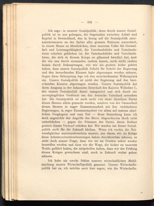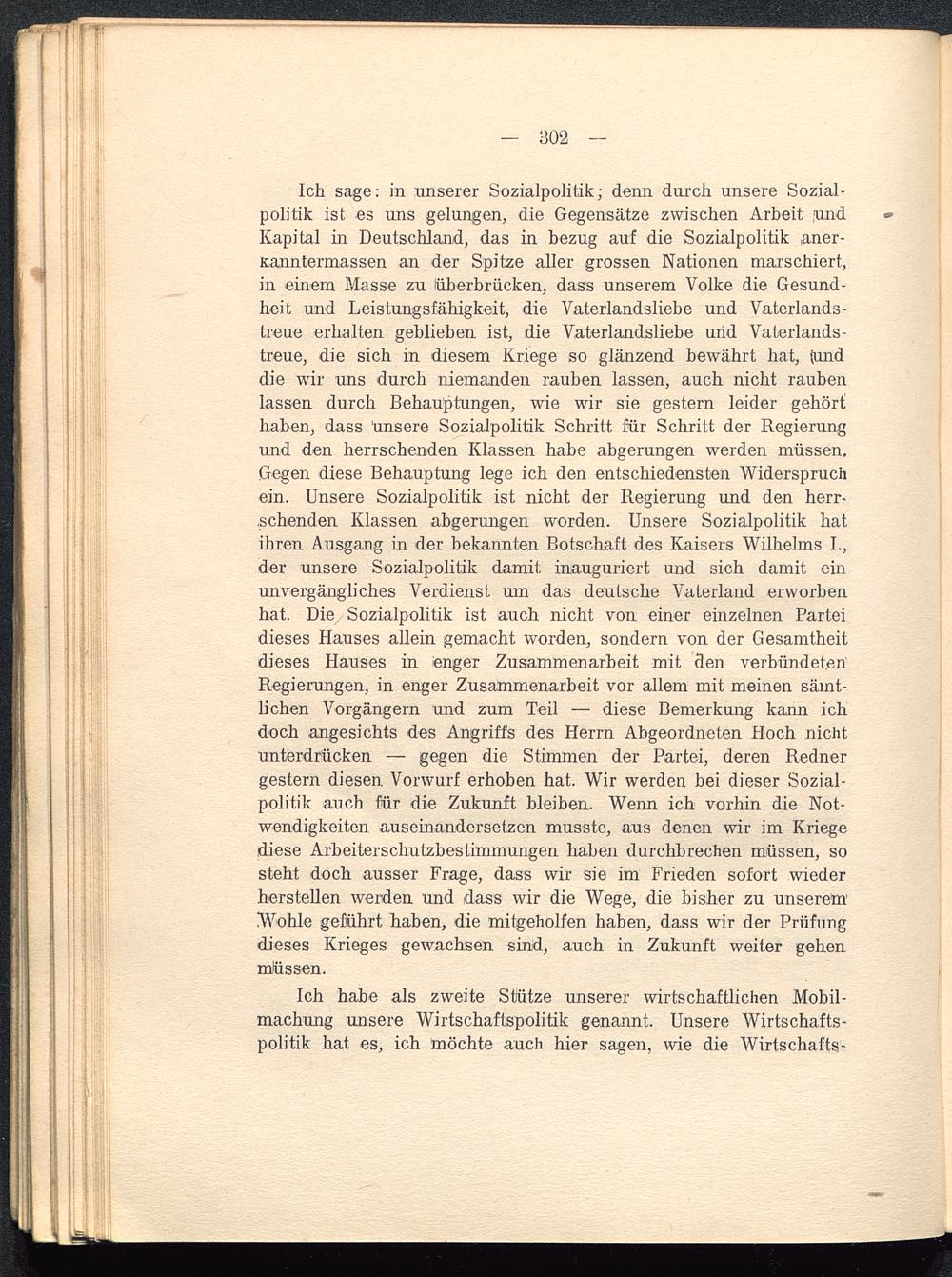 Ich sage: in unserer Sozialpolitik; denn durch unsere Sozial-politik ist es uns gelungen, die Gegensätze zwischen Arbeit undKapital in Deutschland , das in bezug auf die Sozialpolitik aner-Kanntermassen an der Spitze aller grossen Nationen marschiert,in einem Masse zu überbrücken, dass unserem Volke die Gesund-heit und Leistungsfähigkeit, die Vaterlandsliebe und Vaterlands-treue erhalten geblieben ist, die Vaterlandsliebe und Vaterlands-treue, die sich in diesem Kriege so glänzend bewährt hat, (unddie wir uns durch niemanden rauben lassen, auch nicht raubenlassen durch Behauptungen, wie wir sie gestern leider gehörthaben, dass unsere Sozialpolitik Schritt für Schritt der Regierungund den herrschenden Klassen habe abgerungen werden müssen.Gegen diese Behauptung lege ich den entschiedensten Widerspruchein. Unsere Sozialpolitik ist nicht der Regierung und den herr-schenden Klassen abgerungen worden. Unsere Sozialpolitik hatihren Ausgang in der bekannten Botschaft des Kaisers Wilhelms I.,der unsere Sozialpolitik damit inauguriert und sich damit einunvergängliches Verdienst um das deutsche Vaterland erworbenhat. Die Sozialpolitik ist auch nicht von einer einzelnen Parteidieses Hauses allein gemacht worden, sondern von der Gesamtheitdieses Hauses in enger Zusammenarbeit mit den verbündetenRegierungen, in enger Zusammenarbeit vor allem mit meinen sämt-lichen Vorgängern und zum Teil — diese Bemerkung kann ichdoch angesichts des Angriffs des Herrn Abgeordneten Hoch nichtunterdrücken — gegen die Stimmen der Partei, deren Rednergestern diesen Vorwurf erhoben hat. Wir werden bei dieser Sozial-politik auch für die Zukunft bleiben. Wenn ich vorhin die Not-wendigkeiten auseinandersetzen musste, aus denen wir im Kriegediese Arbeiterschutzbestimmungen haben durchbrechen müssen, sosteht doch ausser Frage, dass wir sie im Frieden sofort wiederherstellen werden und dass wir die Wege, die bisher zu unserem 1Wohle geführt haben, die mitgeholfen haben, dass wir der Prüfungdieses Krieges gewachsen sind, auch in Zukunft weiter gehenmüssen.