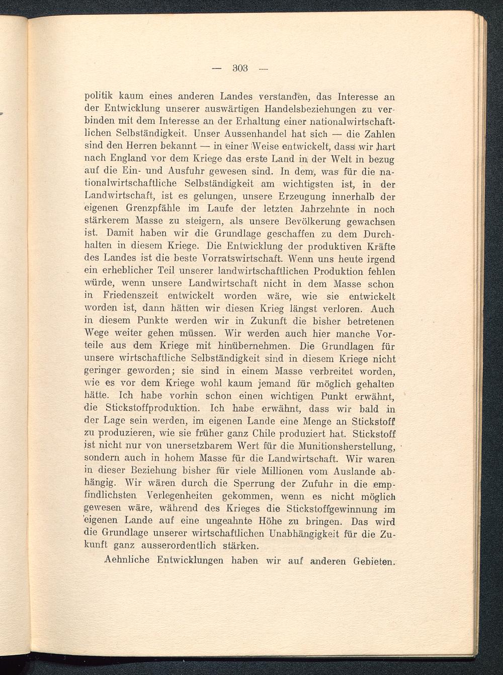 politik kaum eines anderen Landes verstanden, das Interesse ander Entwicklung unserer auswärtigen Handelsbeziehungen zu ver-binden mit dem Interesse an der Erhaltung einer nationalvvirtschaft-lichen Selbständigkeit. Unser Aussenhandel hat sich — die Zahlensind den Herren bekannt — in feiner Weise entwickelt, dassl wir hartnach England Vor dem Kriege das erste Land in der Welt in bezugauf die Ein- und Ausfuhr gewesen sind. In dem 1 , was für die na-tionalwirtschaftliche Selbständigkeit am wichtigsten ist, in derLandwirtschaft, ist es gelungen, unsere Erzeugung innerhalb dereigenen Grenzpfähle im Laufe der letzten Jahrzehnte in nochstärkerem Masse zu steigern, als unsere Bevölkerung gewachsenist. Damit haben wir die Grundlage geschaffen zu dem Durch-halten in diesem Kriege. Die Entwicklung der produktiven Kräftedes Landes ist die beste Vorratswirtschaft. Wenn uns heute irgendein erheblicher Teil unserer landwirtschaftlichen Produktion fehlenwürde, wenn unsere Landwirtschaft nicht in dem Masse schonin Friedenszeit entwickelt worden wäre, wie sie entwickeltworden ist, dann hätten wir diesen Krieg längst verloren. Auchin diesem Punkte werden wir in Zukunft die bisher betretenenWege weiter gehen müssen. Wir werden auch hier manche Vor-teile aus dem Kriege mit hinübernehmen. Die Grundlagen fürunsere wirtschaftliche Selbständigkeit sind in diesem Kriege nichtgeringer geworden; sie sind in einem Masse verbreitet worden,wie es vor dem Kriege wohl kaum jemand für möglich gehaltenhätte. Ich habe vorhin schon einen wichtigen Punkt erwähnt,die Stickstoffproduktion. Ich habe erwähnt, dass wir bald inder Lage sein werden, im eigenen Lande eine Menge an Stickstoffzu produzieren, wie sie früher ganz Chile produziert hat. Stickstoffist nicht nur von unersetzbarem Wert für die Munitionsherstellung,sondern auch in hohem Masse für die Landwirtschaft. Wir warenin dieser Beziehung bisher für viele Millionen vom Auslande ab-hängig. Wir wären durch die Sperrung der Zufuhr in die emp-findlichsten Verlegenheiten gekommen, wenn es nicht möglichgewesen wäre, während des Krieges die Stickstoffgewinnung imeigenen Lande auf eine ungeahnte Höhe zu bringen. Das wirddie Grundlage unserer wirtschaftlichen Unabhängigkeit für die Zu-kunft, ganz ausserordentlich stärken.