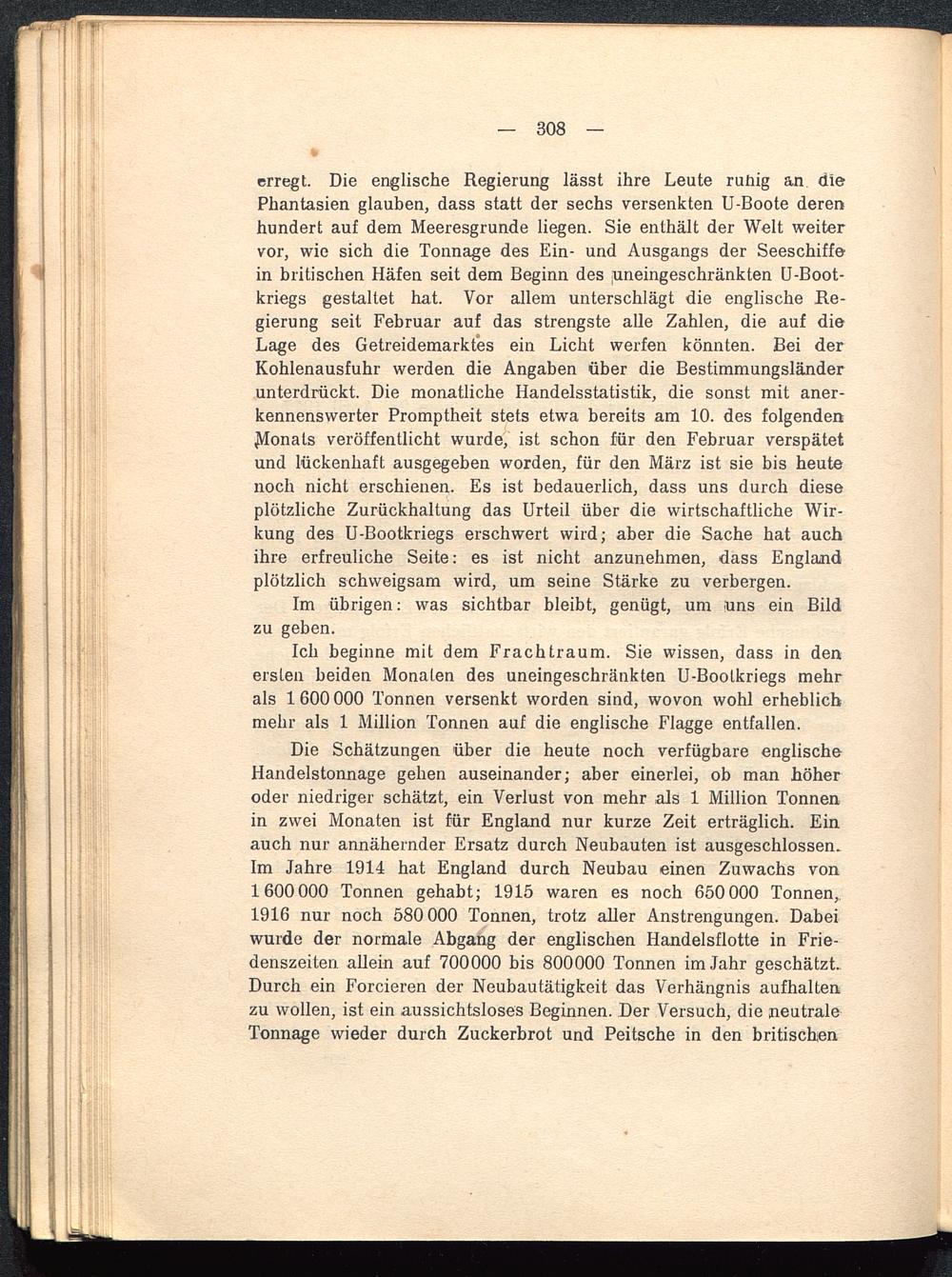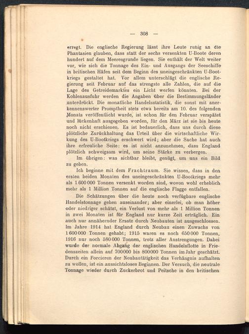 Ich beginne mit dem Frachtraum. Sie wissen, dass in denersten beiden Monaten des uneingeschränkten U-Bootkriegs mehrals 1 600 000 Tonnen versenkt worden sind, wovon wohl erheblichmehr als 1 Million Tonnen auf die englische Flagge entfallen.