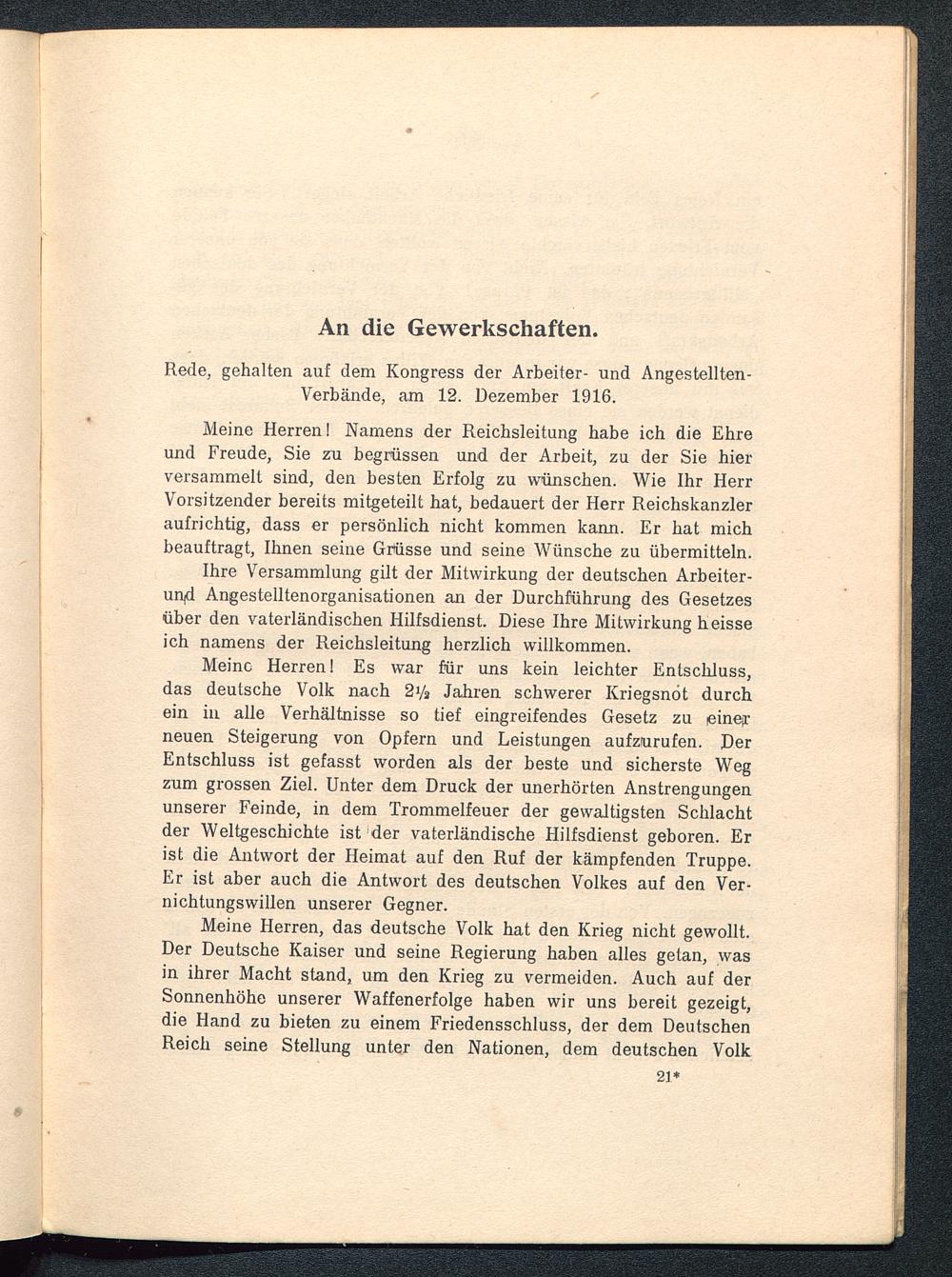 Rede, gehalten auf dem Kongress der Arbeiter- und Angestellten-Verbände, am 12. Dezember 1916.