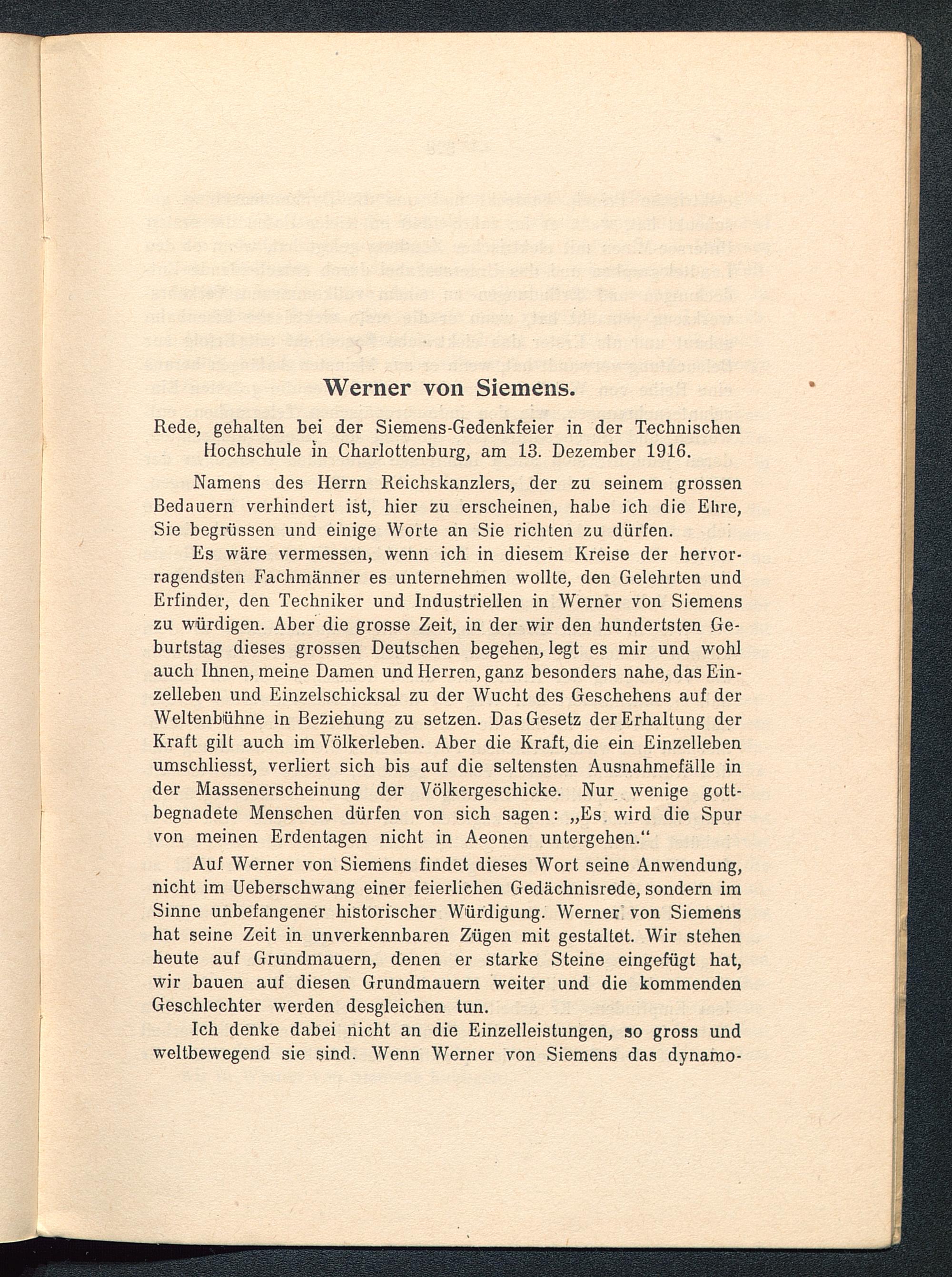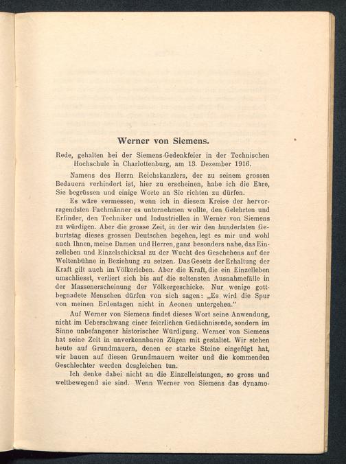 Rede, gehalten bei der Siemens-Gedenkfeier in der TechnischenHochschule in Charlottenburg , am 13. Dezember 1916.