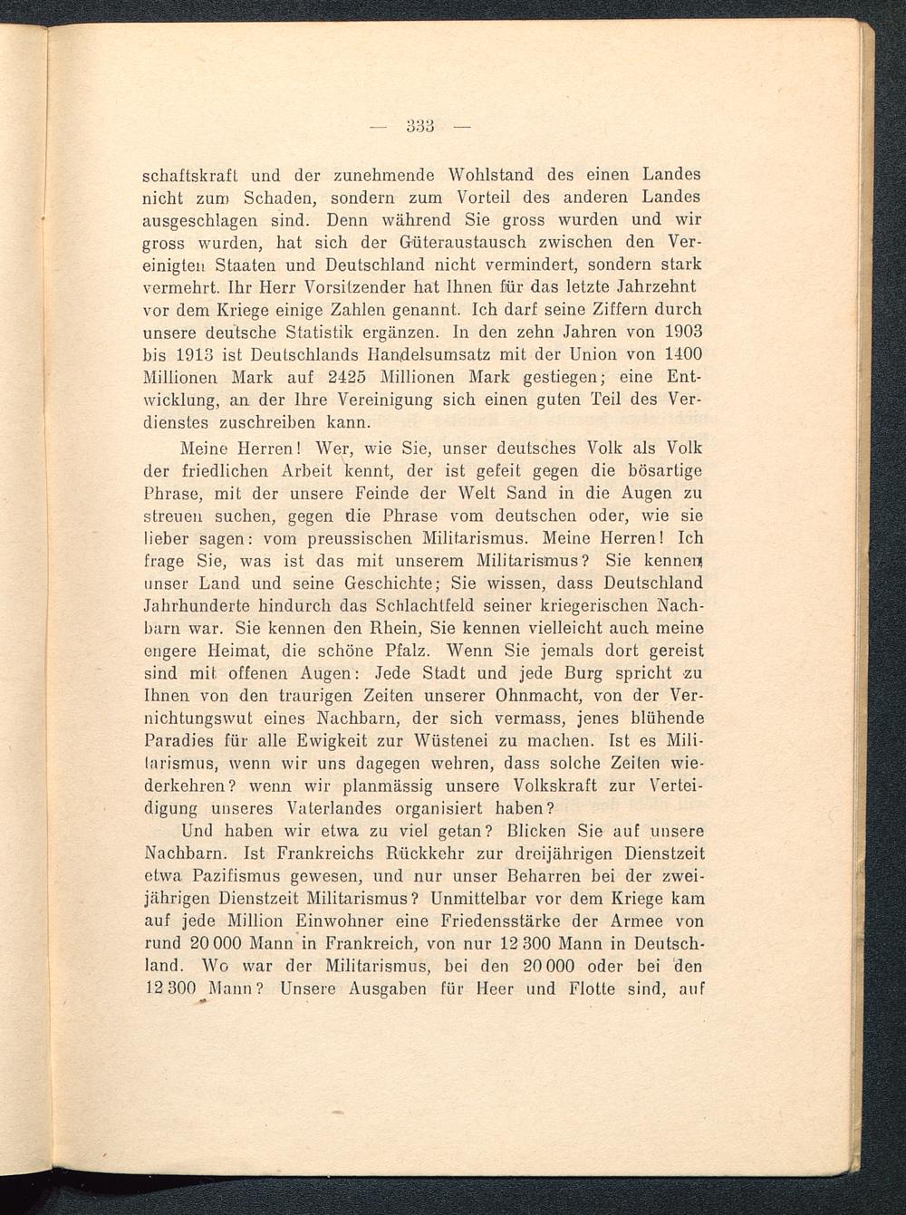 Meine Herren! Wer, wie Sie, unser deutsches Volk als Volkder friedlichen Arbeit kennt, der ist gefeit gegen die bösartigePhrase, mit der unsere Feinde der Welt Sand in die Augen zustreuen suchen, gegen die Phrase vom deutschen oder, wie sielieber sagen: vom preussischen Militarismus. Meine Herren! Ichfrage Sie, was ist das mit unserem Militarismus? Sie kennen!unser Land und seine Geschichte; Sie wissen, dass Deutschland Jahrhunderte hindurch das Schlachtfeld seiner kriegerischen iNach-barn war. Sie kennen den Rhein , Sie kennen vielleicht auch meineengere Heimat, die schöne Pfalz. Wenn Sie jemals dort gereistsind mit offenen Augen: Jede Stadt und jede Burg spricht zuIhnen von den traurigen Zeiten unserer Ohnmacht, von der Ver-nichtungswut eines Nachbarn, der sich vermass, jenes blühendeParadies für alle Ewigkeit zur Wüstenei zu machen. Ist es Mili-tarismus, wenn wir uns dagegen wehren, dass solche Zeiten wie-derkehren? wenn wir planmässig unsere Volkskraft zur Vertei-digung unseres Vaterlandes organisiert haben?