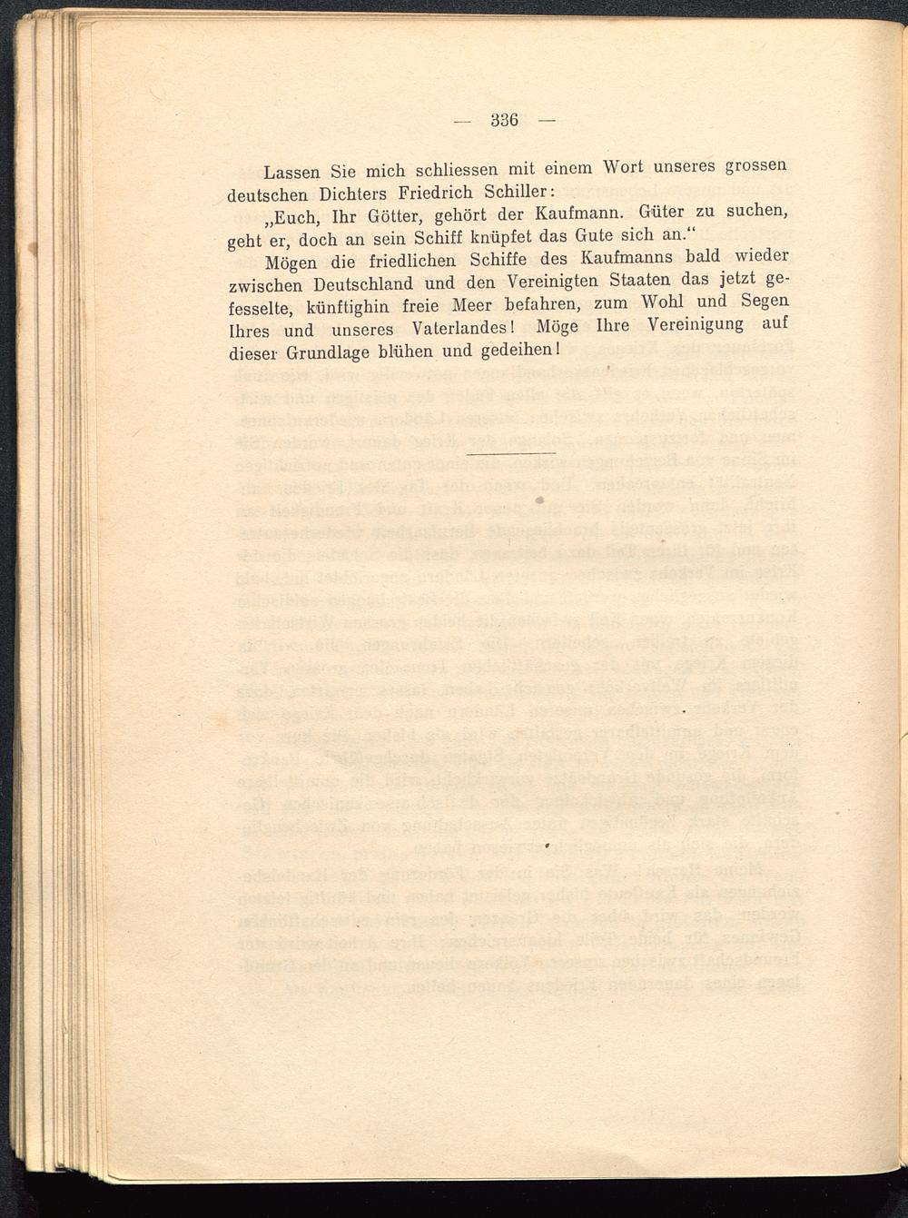 Mögen die friedlichen Schiffe des Kaufmanns bald wiederzwischen Deutschland und den Vereinigten Staaten das jetzt ge-fesselte, künftighin freie Meer befahren, zum Wohl und SegenIhres und unseres Vaterlandes! Möge Ihre Vereinigung aufdieser Grundlage blühen und gedeihen!