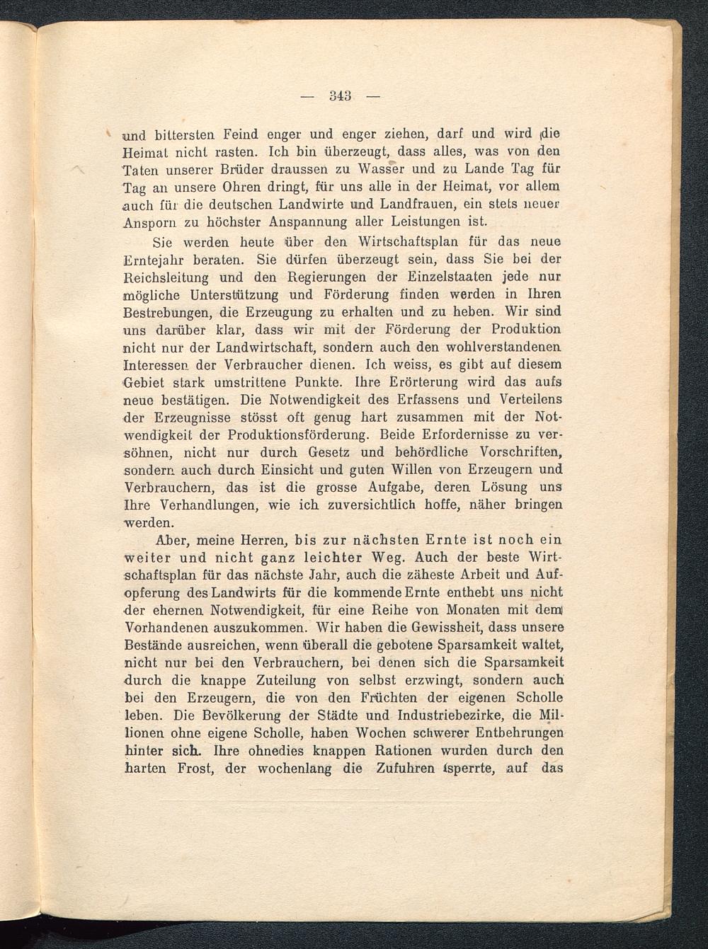 und bittersten Feind enger und enger ziehen, darf und wird (dieHeimat nicht rasten. Ich bin überzeugt, dass alles, was von denTaten unserer Brüder draussen zu Wasser und zu Lande Tag fürTag an unsere Ohren dringt, für uns alle in der Heimat, vor allemauch für die deutschen Landwirte und Landfrauen, ein stets neuerAnsporn zu höchster Anspannung aller Leistungen ist.